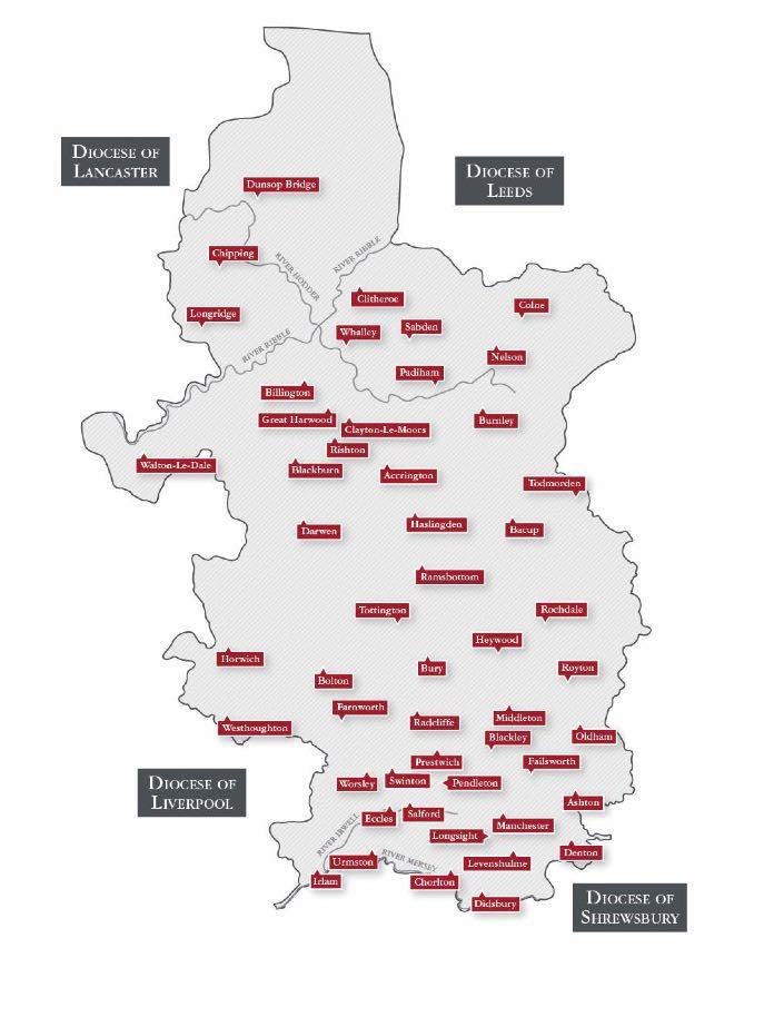 Comprising the Hundreds of Salford and Blackburn in the County of Lancaster and the parish of Dunsop Bridge, the Diocese of Salford encompasses most of Greater Manchester and a large part of Lancashire, between the River Mersey and the River Ribble, as well as some parishes north of the Ribble and Todmorden in Calderdale, West Yorkshire