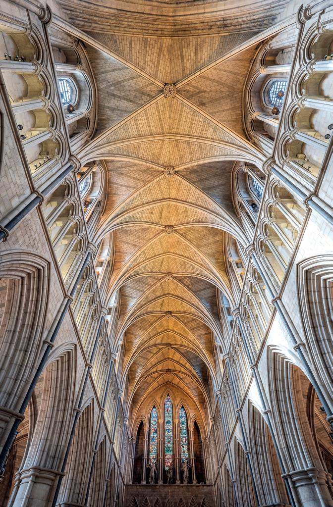 This fine organ has had an eventful history. By 1895 it had grown to a 5-manual instrument, complete with an Echo or Celestial division located high above the south transept and played from the topmost row of keys. The Surveyor of the Fabric, J L Pearson (famed for Truro Cathedral) had designed a matching pair of cases to stand on either side of the screen and clothe the main part of the organ. Magnificent though these were, the organist complained that they muffled the sound of the main diapason chorus. A major rebuild by Harrisons of Durham was completed just in time for the 1937 Coronation, but though the instrument was glorious in tone