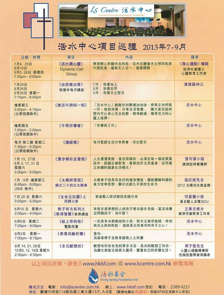 聖神內更新團體於2013年10月22日至12月4日期間,在部分每週祈禱會舉行為期 七週共八講的「 聖神內生活研習班 」(LSS),歡迎教友或想認識天主教信仰的人 士參加。