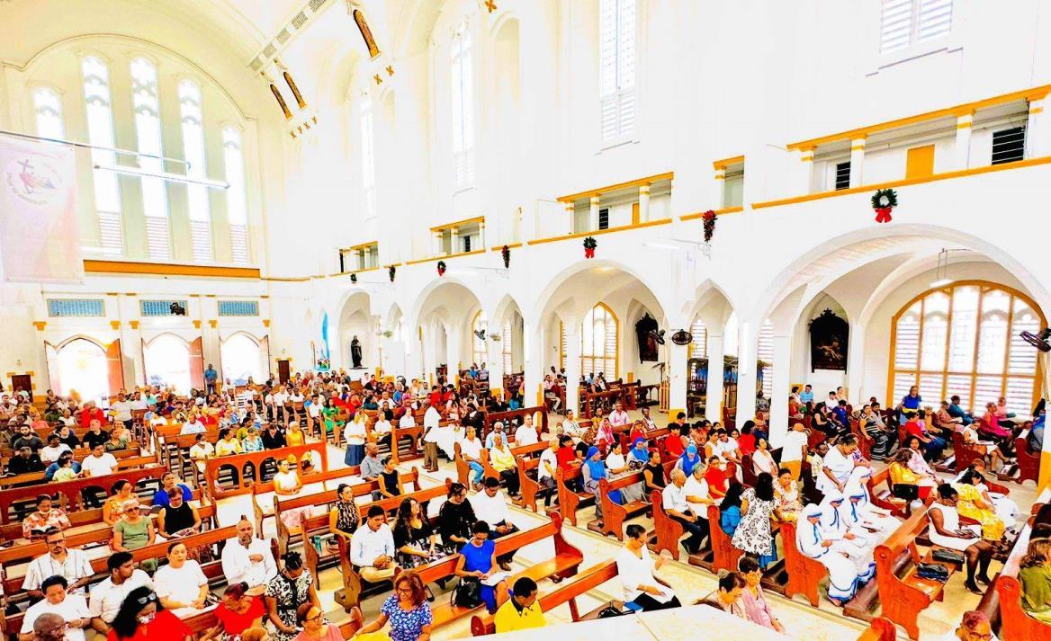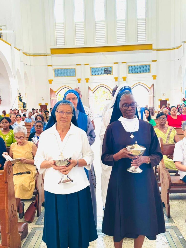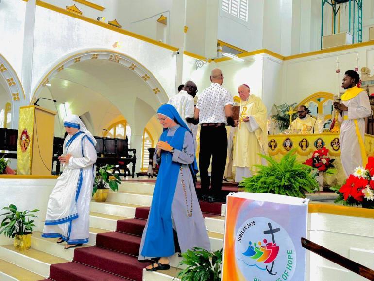 On Sunday, December 29th 2024, Bishop Francis Alleyne OSB welcomed the Holy Year of the Jubilee 2025 locally witha Mass at 9am at the Cathedral of the Immaculate Conception, Brickdam, Georgetown. The Mass was celebrated by Bishop Francis and concelebrated by Fr. George Kaiprampatt Poulo SJ and Fr. Santiago Felipe Lantigua Santana SJ. The Jubilee Year was declared by Pope Francis in Rome on December 24th and in each Diocese in the world on December 29th - the feast of the Holy Family of Jesus,Mary and Joseph. Faith communities throughout the entire Diocese joined in one celebration on that day by gathering for worship in their churches at 9am, and participated virtually in the mass livestreamed from the Cathedral, viewing it via projector or TV.