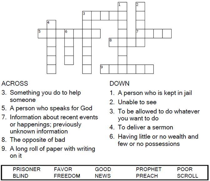 One day Jesus was in Nazareth on the Sabbath so he went to the temple as he always did. When he stood up to read the Scriptures, he was handed the book of the prophet Isaiah. He looked through the book until he found the part that said, "The Lord's Spirit has come to me and has chosen me to tell the good news to the poor. He has sent me to free the prisoners, give sight to the blind, and to set everyone free from their suffering."