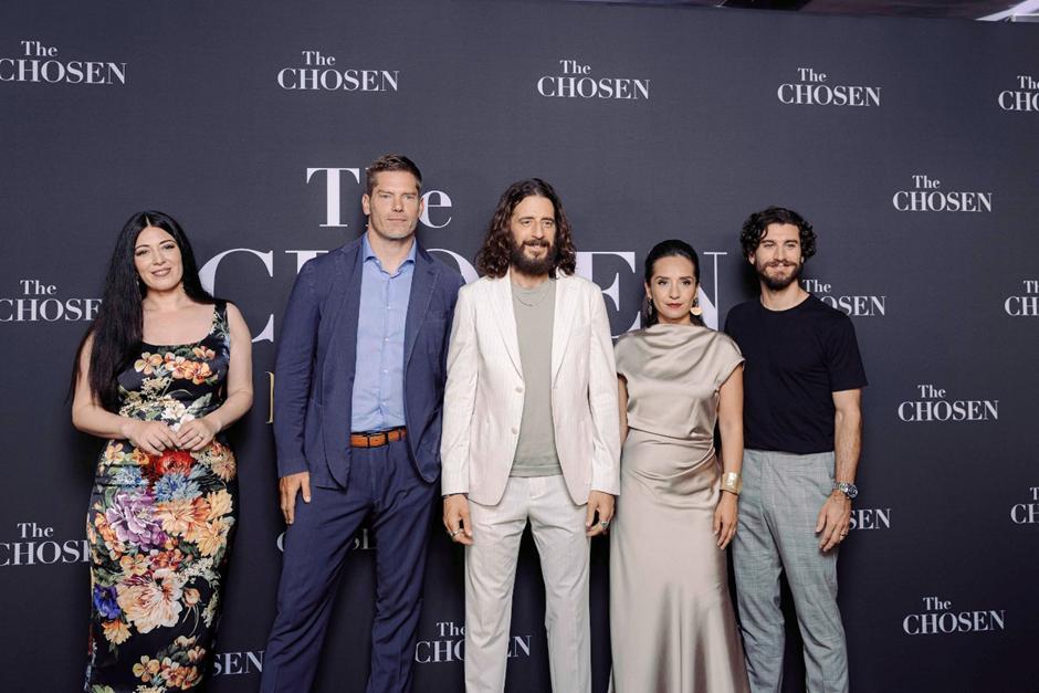 Members of the cast and crew of the series, "The Chosen," pose for a picture at a red-carpet screening at a Rome movie theater June 23, 2025. From left to right are: Actor Elizabeth Tabish, who portrays Mary Magdalene; Dallas Jenkins, creator and director; actors Jonathan Roumie, who portrays Jesus; Vanessa Benavente, who portrays Jesus' mother Mary; and George Xanthis, who portrays John. (CNS photo/courtesy TheChosen.tv)