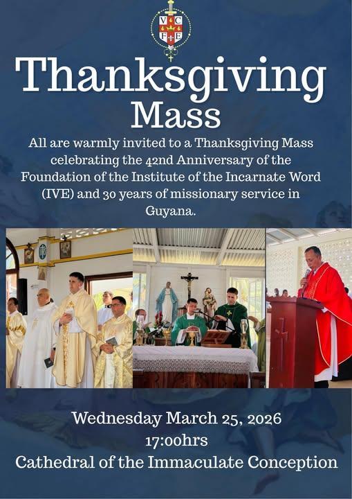 17:00hrs – Thanksgiving Mass at the Cathedral celebrating the 42nd Anniversary of the foundation of the Incarnate Word (IVE) and 30 years of service in Guyana.