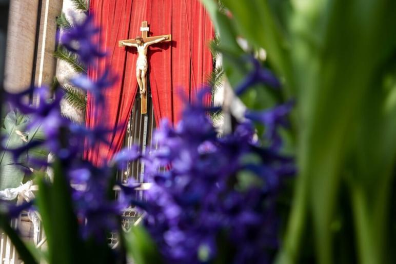 A crucifix is seen behind purple hyacinths on the steps of St. Peter’s Basilica at the Vatican April 19, 2025, as volunteers prepare St. Peter’s Square for Easter morning Mass. (CNS photo/Lola Gomez)