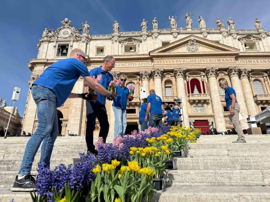 Volunteers organize trays of flowers on the steps of St. Peter’s Basilica at the Vatican April 19, 2025, as part of the preparations for Easter Mass. (CNS photo/ Lola Gomez)