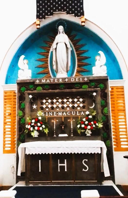 The Lady Altar in the Cathedral was imported from Italy and erected in 1931. It is made of grey marble and decorated with a grape vine, crosses, a moon and star. Below the statue are the Latin words “MATER DEI” meaning Mother of God. At a lower level are the words “SINE MACULA” meaning “Without Blemish” or Immaculate. The statue - also in marble - stands in an archway above the altar.