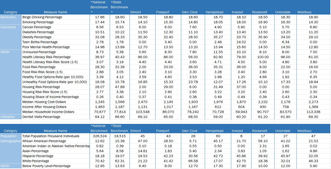 Nassau County is unique in that it presents complex polarity, representing a wide range of both healthy and sick community members from opposite ends of the health spectrum. There are eight select communities in which a variety of socioeconomic factors lead to vast health disparities. These select communities were determined by the Nassau County Department of Health with concurrence from hospital partners. These communities are: Freeport, Hempstead, Inwood, Westbury, Roosevelt, Uniondale, Elmont, and Glen Cove. Catholic Health and its partners continue to concentrate efforts in these select communities.