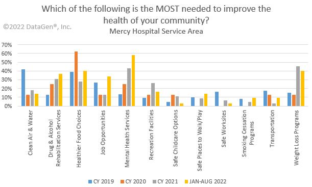 Health behaviors, outcomes, and social determinants of health indicators in the chart below compare Mercy Hospital’s key outreach communities (the eight select communities).