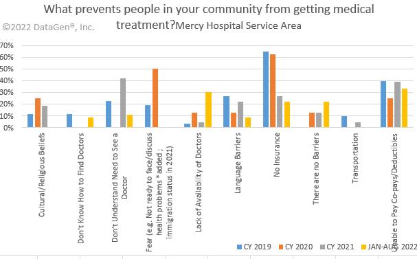 Mercy Hospital works with a broad range of partners to connect with the community, to assess their needs through distribution and promotion of data collection tools, and to provide interventions in collaborative settings, when appropriate. See page 9 for our extensive list of partners. We also rely on the LIHC and its role as neutral convener and regional leader, espousing the collective impact model and framework.4 As such, the LIHC serves as a backbone organization, providing its diverse partners with data analytics and administrative support in the areas of community outreach and education, and media relations support. LIHC’s networking capabilities, its programs around walking and chronic disease awareness, and health messaging efforts reinforce and augment the interventions we provide in the chronic disease and mental health needs spaces so that we are continually in touch with the broader community. See Appendix F for a list of LIHC partners.