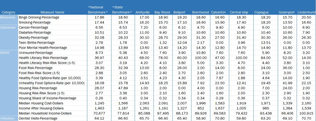 Throughout Suffolk County, there are 17 identified communities in which a variety of socioeconomic factors lead to vast health disparities. These identified communities were determined by the Suffolk County Department of Health Services with concurrence from hospital partners. These communities are: Wyandanch, Central Islip, Brentwood, Riverhead, Bay Shore, Copiague, Mastic, Mastic Beach, Bellport, Amityville, Calverton, Patchogue, Shirley, Greenport, Lindenhurst, West Babylon, and Ridge.
