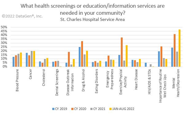 Primary data was obtained from a community health needs assessment sent to individuals and a similar survey to community-based organization leaders1. Additionally, we looked at results from two qualitative studies to round out our primary data.2 Secondary data was derived from publicly-available data sets curated by DataGen into its proprietary data analytics platform, CHNA Advantage ™ , offering 200 plus metrics to determine health issues within Suffolk County.3 As such, priorities selected for the 2022- 2024 cycle remain unchanged from the 2019 – 2021 cycle selection, and the selected health disparities in which partners are focusing their efforts rests on the inequities experienced by those in historically underserved communities and communities of color. Additional Prevention Agenda priorities/disparities being addressed by St. Charles are outlined in the 2022-2024 work plan (See Appendix E).
