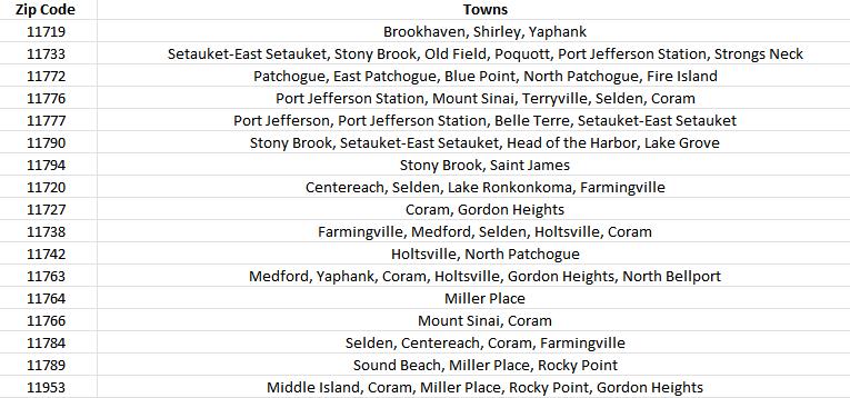St. Charles primary service area is Suffolk County. The chart below defines the zip codes and municipalities (towns) comprising St. Charles’ service area.