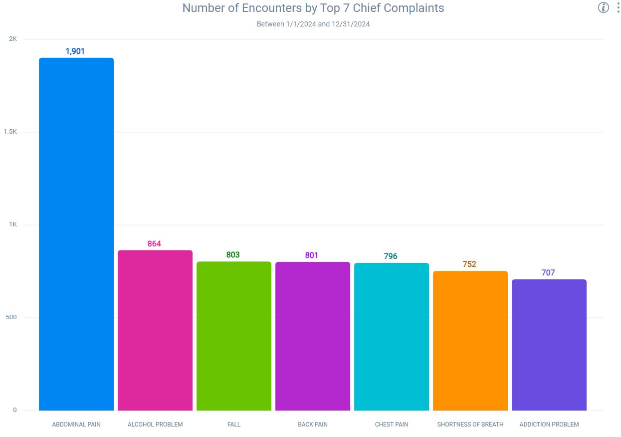 Emergency Department Visits – analysis of St. Charles Hospital emergency department visits during the time period January 1st, to December 31st, 2024, to discern top diagnoses.
