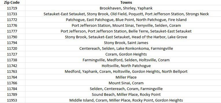 These communities identified are: Amityville, Bay Shore, Brentwood, Calverton, Central Islip, Copiague, Greenport, Mastic, Middle Island, Riverhead, and Wyandanch.