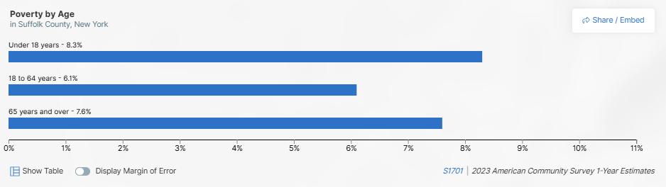 Suffolk County had a lower percent of the population in poverty at 6.8% compared to 14.2% in New York State in 2023. Individuals under 18 years old had the highest percent in poverty at 8.3% compared to 7.6% in those 65 years and older and 6.1% among those 18 to 64 years 10