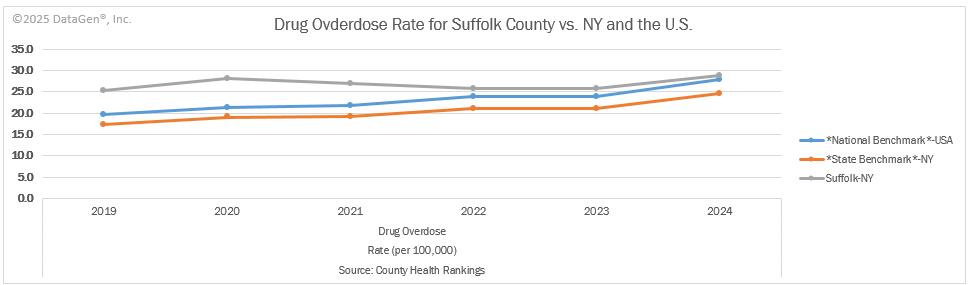 Substance use and opioid-related outcomes are also priority areas for the region. According to the 2025 Robert Wood Johnson Foundation County Health Rankings, Suffolk County had 33 drug overdose deaths per 100,000 people from 2020-2022 which was higher than the 29 per 100,000 in New York and 31 per 100,000 in the nation. 25