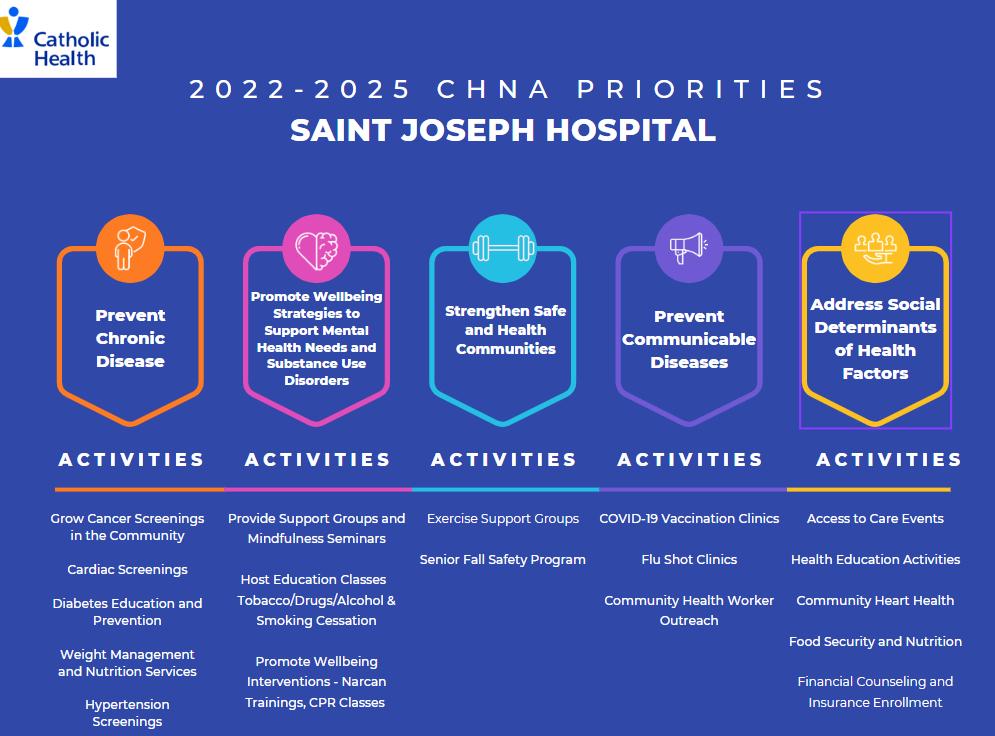 St. Joseph remains committed to providing the community with evidence-based and promising practice programs that address chronic diseases and mental health/substance misuse. Additionally, as a faith-based provider, it has always been our mission to address the social needs of our patients and community members. Our interventions are broad and far reaching. Refer to our work plan for specific interventions, measures, partners, goals and objectives.