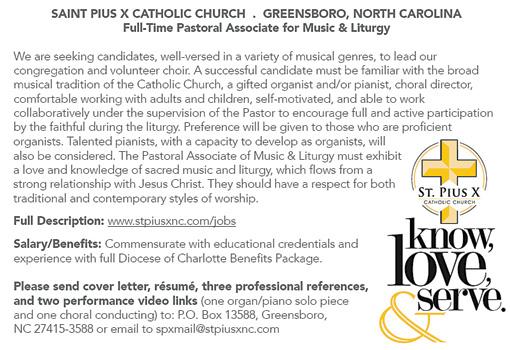 Please send resume and salary/history requirements to Sue Sigler, Controller, Diocese of Charlotte, 1123 South Church Street, Charlotte, NC 28203-4003 or email to sasigler@rcdoc.org.