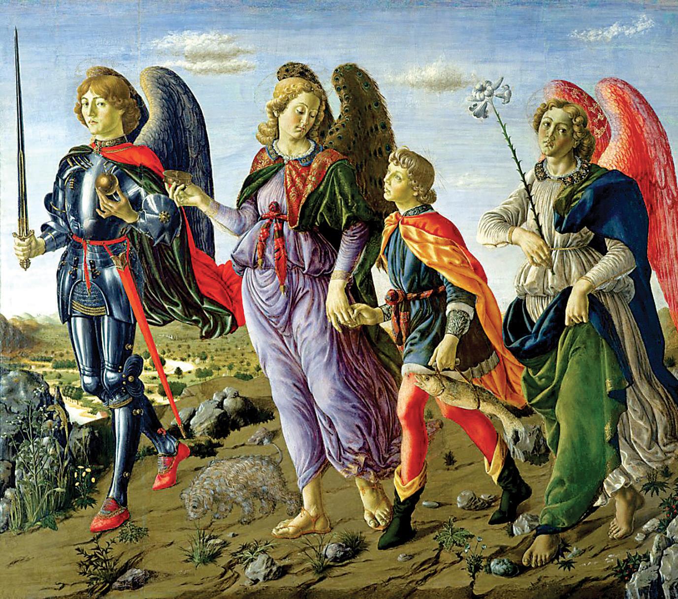 Disguised as a human in the Book of Tobit, Raphael refers to himself as “Azarias the son of the great Ananias” and travels alongside Tobit’s son, Tobiah. Once Raphael returns from his journey with Tobiah, he declares to Tobit that he was sent by the Lord to heal his blindness and deliver Sarah, Tobiah’s future wife, from the demon Asmodeus. It is then that his true healing powers are revealed and he makes himself known as “the angel Raphael, one of the seven, who stand before the Lord” (Tobit 12:15).