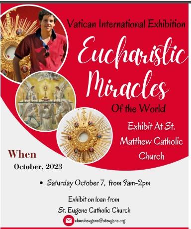 DISCOVER THE REAL PRESENCE’: 9 a.m.-1 p.m. Saturday, Oct. 7, St. Matthew Church, 8015 Ballantyne Commons Pkwy., Charlotte. Come explore Eucharistic Miracles with Ray Grijalba, host of the YouTube channel The Joy of the Faith and co-producer of the movie The New Manna. Continental breakfast will be served. For details, visit www.stmatthewcatholic.org/divine-mercy-day-2023.