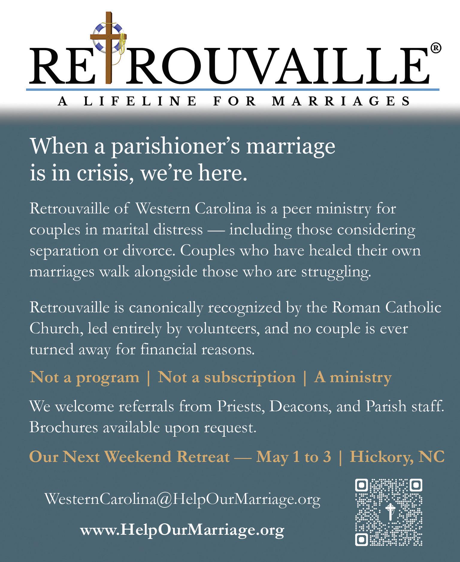 VIÑEDO DE RAQUEL: ¿Usted o alguien cercano está buscando sanar las secuelas de un aborto anterior? Retiros de fin de semana son ofrecidos por Caridades Católicas para hombres y mujeres en todas las regiones de la Diócesis de Charlotte.Para obtener más información, comuníquese con Lorena Haynes al 828-585-0483 o por correo electrónico a lorena_haynes@yahoo.com.
