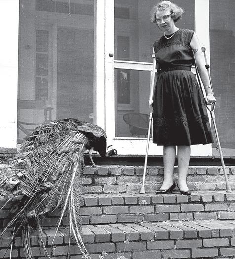 Catholic writer Flannery O’Connor shares the steps with one of her pet peacocks in an undated photo. This Southern writer’s Catholic faith shaped her vision of a world that often ignores goodness.
