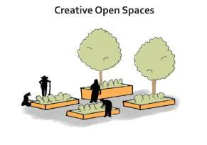 These green spaces have been placed throughout the concept in such a way that green infrastructure is smartly integrated with the public realm. Residents (both young and old) are encouraged to interact with these places on a daily basis, as well as to care for and preserve them.