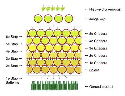 Sherry is een mengeling van wijnen uit verschillende jaren, er staat dus doorgaans geen jaartal op het etiket tenzij om aan te geven hoeveel tijd de wijn in het solerasysteem doorbracht. De vaten of botas met sherry liggen opgestapeld in een kelder, de solera. In de bovenste vaten – criaderas – zit de jongste wijn, in de onderste vaten – soleras –, die op de 'sol' liggen (grond van vochtige zand zoals die in de arena's), is de sherry klaar om gebotteld te worden. De vaten zijn met elkaar verbonden. Als de onderste vaten gedeeltelijk in de flessen geleegd worden, vullen de vaten erboven ze bij. De vaten daarboven vullen de tweede rij vaten weer bij, enzovoort. De combinatie van soleras en criaderas vormt een heus ecosysteem waarbij zelfs spinnen en houtinsecten hun rol spelen.