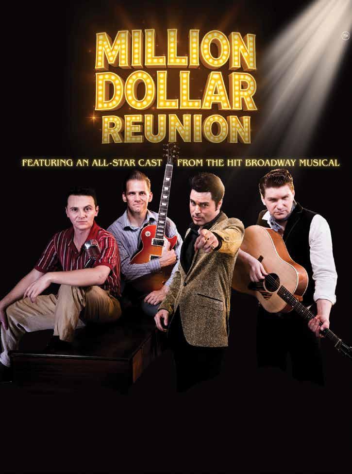 The Million Dollar Reunion is an electrifying new show that pays tribute to the legendary music born at SUN Studios in Memphis, Tennessee—widely celebrated as the birthplace of Rock and Roll. Produced by Broadway veteran Bobby Taylor, and featuring former cast members of the worldwide hit show Million Dollar Quartet, the Million Dollar Reunion takes the audience on a spirited journey to an earlier time, with dynamic performances of some of the greatest hits of Rock and Roll. No one can ever forget Jerry Lee Lewis’ “Whole Lot of Shakin’ Goin’ On,” Johnny Cash’s “Folsom Prison Blues,” Carl Perkins’ “Blue Suede Shoes,” or Elvis Presley’s “Good Rockin’ Tonight.” All of these hits, and many more, will remind the audience of a time when a musical revolution was occurring in America and soon the entire world. So, come join us, as we take a musical trip back in time, when the Blues, Country, and Gospel music had a baby, and they named it ROCK AND ROLL!