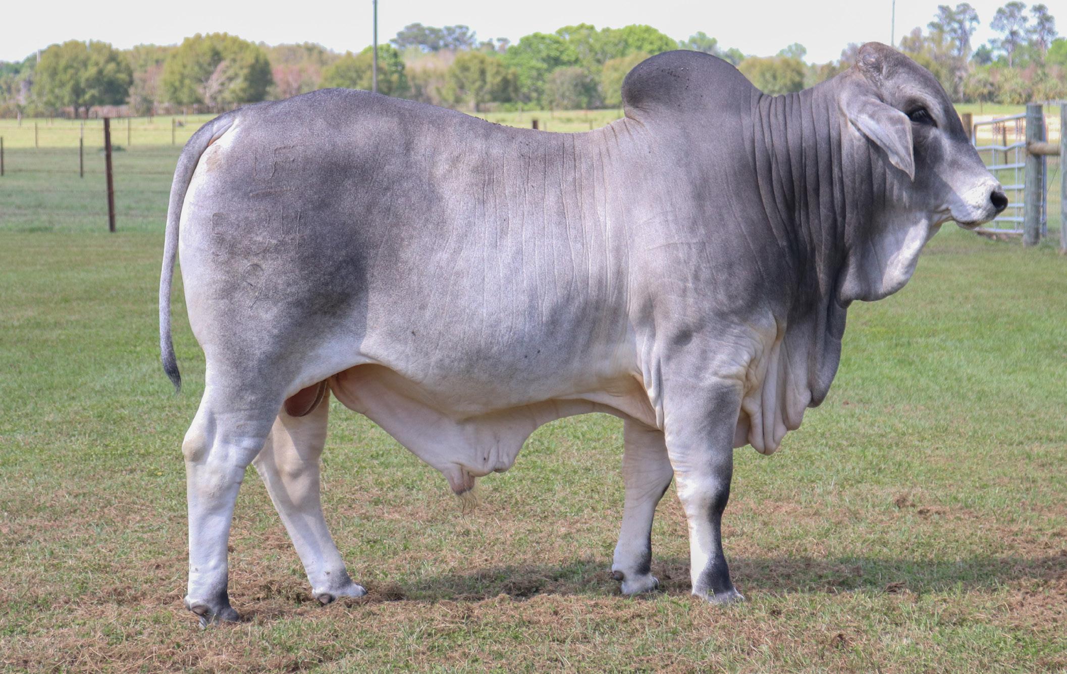 770/9 is the youngest bull in the sale. He was not dehorned as a calf. This moderate framed bull offers an outcross pedigree to most Florida breeding. Sired by NMSU DUBO CHERRA 1120 with some Flying W breeding on the bottom, this young bull is deep sided, with plenty of bone. This bull is super gentle and moderate framed with a lot of breed character.