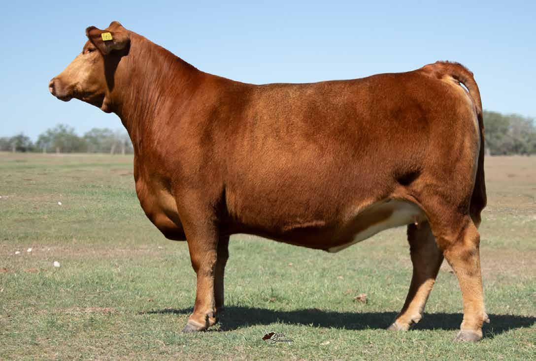 Kristy 89M is a striking red-tinged Simbrah female backed by the renowned Kristy cow family and sired by Smith McCrary Andy Black. She combines balance and femininity with plenty of rib and structural correctness, as her pictureperfect profile shows. Her pedigree is rich with breed-leading sires including Smith Satisfies, giving her both maternal predictability and performance. Kristy 89M is the kind of open heifer that blends power with eye appeal. This is a female that will fit seamlessly into the front pasture while raising productive, marketdriven calves.