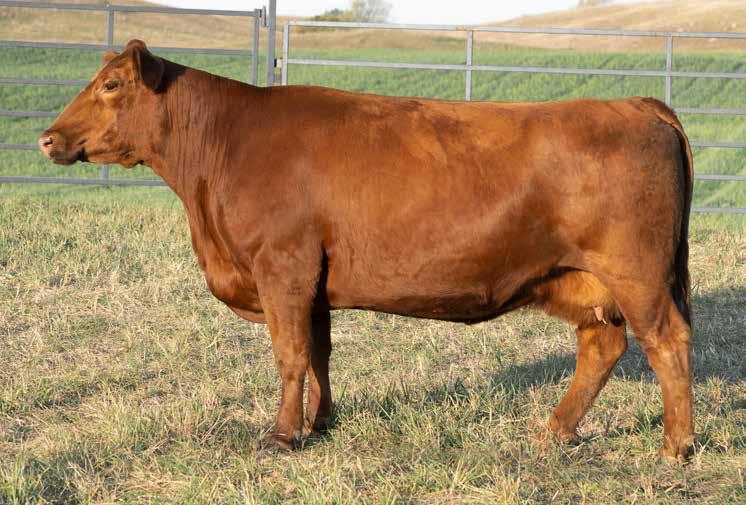 • A unique, 3/8 SM female with the red gene and a tremendous look! Her added marbling is proven by her 111 average IMF ratio on her calves. She is missing one teat due to mastitis; we have learned the best way to treat for those is not fight it and just cut it off. Our neighbor Peder, the best dairyman in the nation can attest that a cow with three quarters sees almost no drop in milk production. This cows’ calves have been extremely marketable as well as she passes on her great look, marbling and added performance every time.