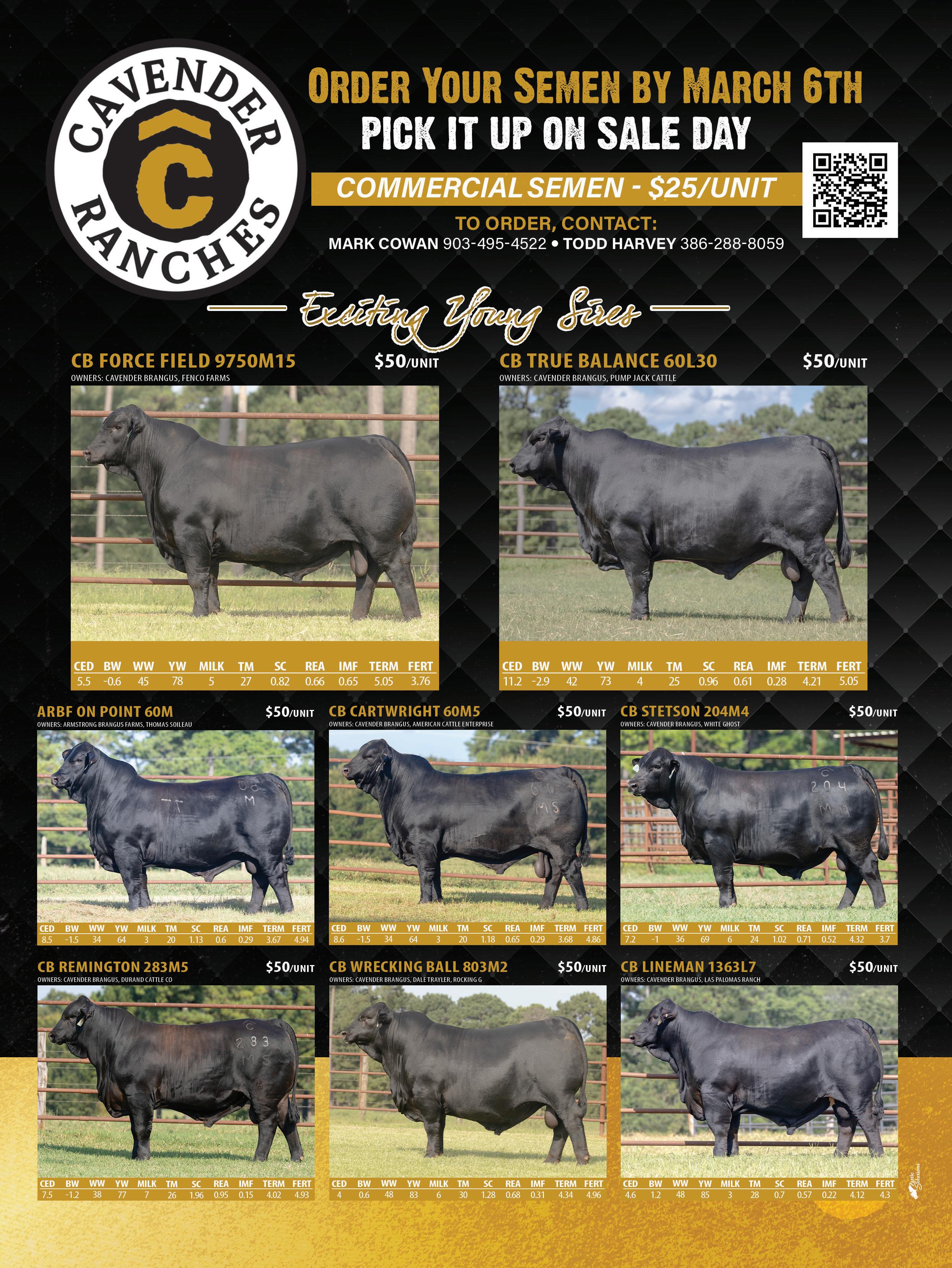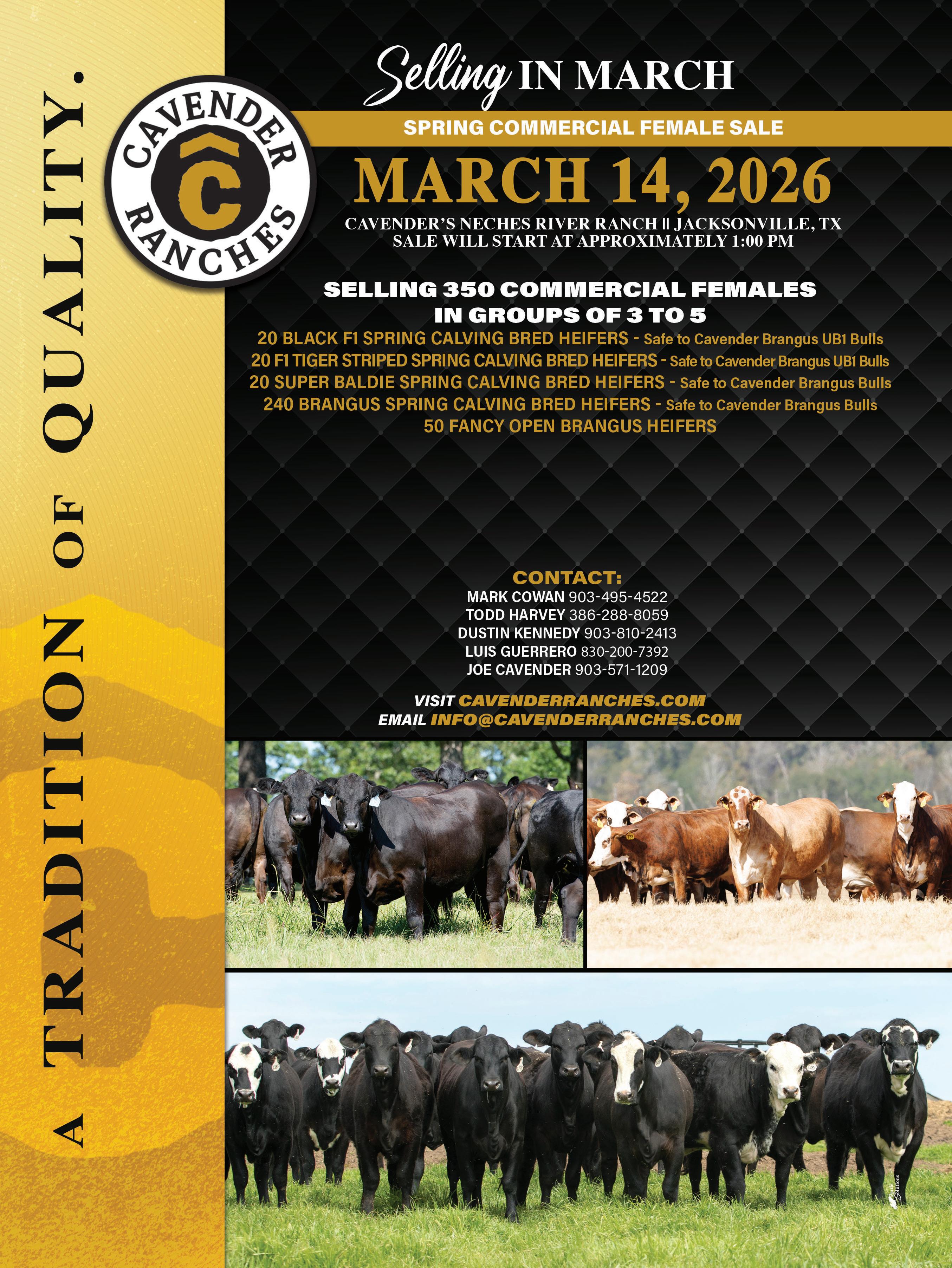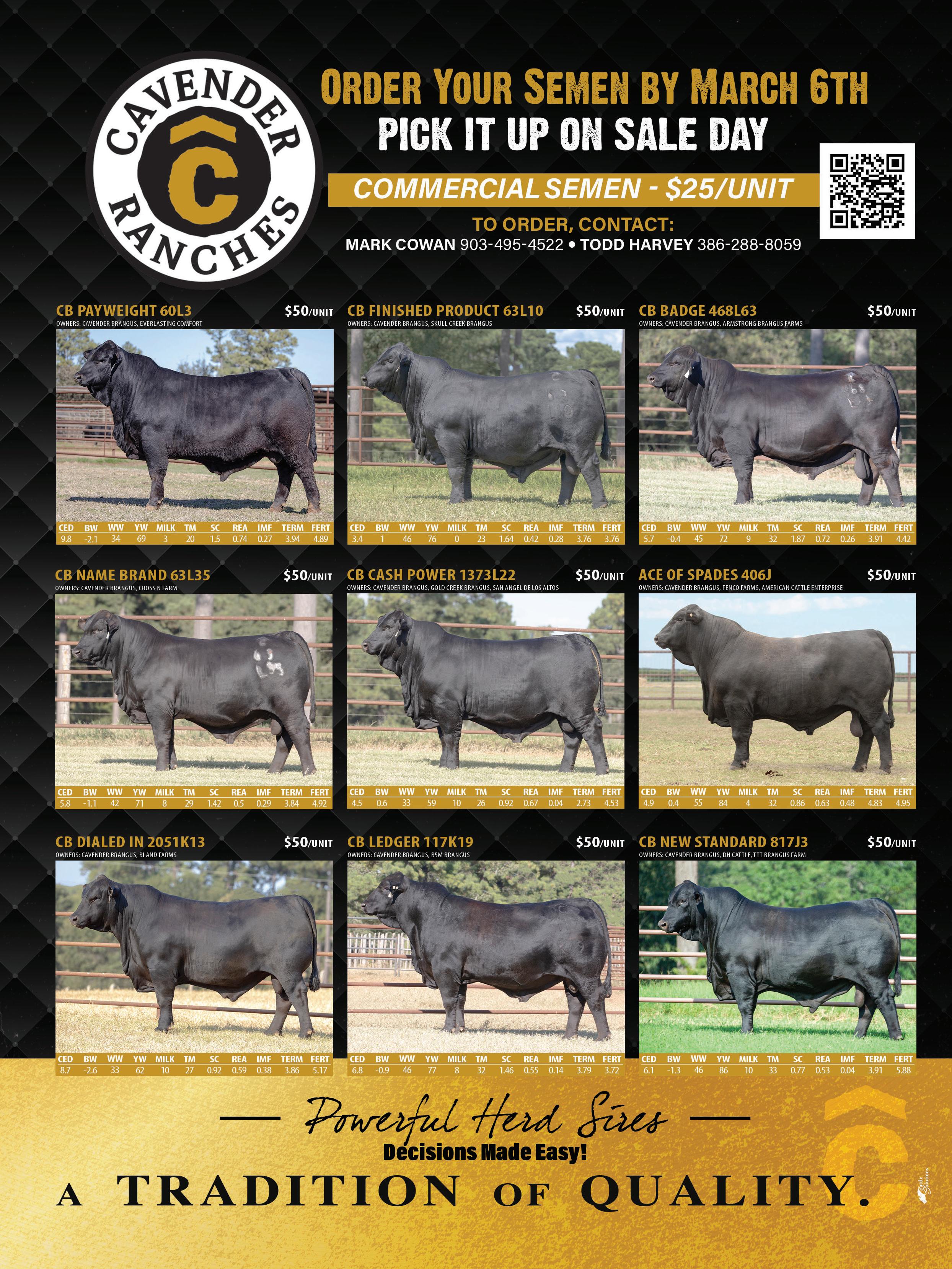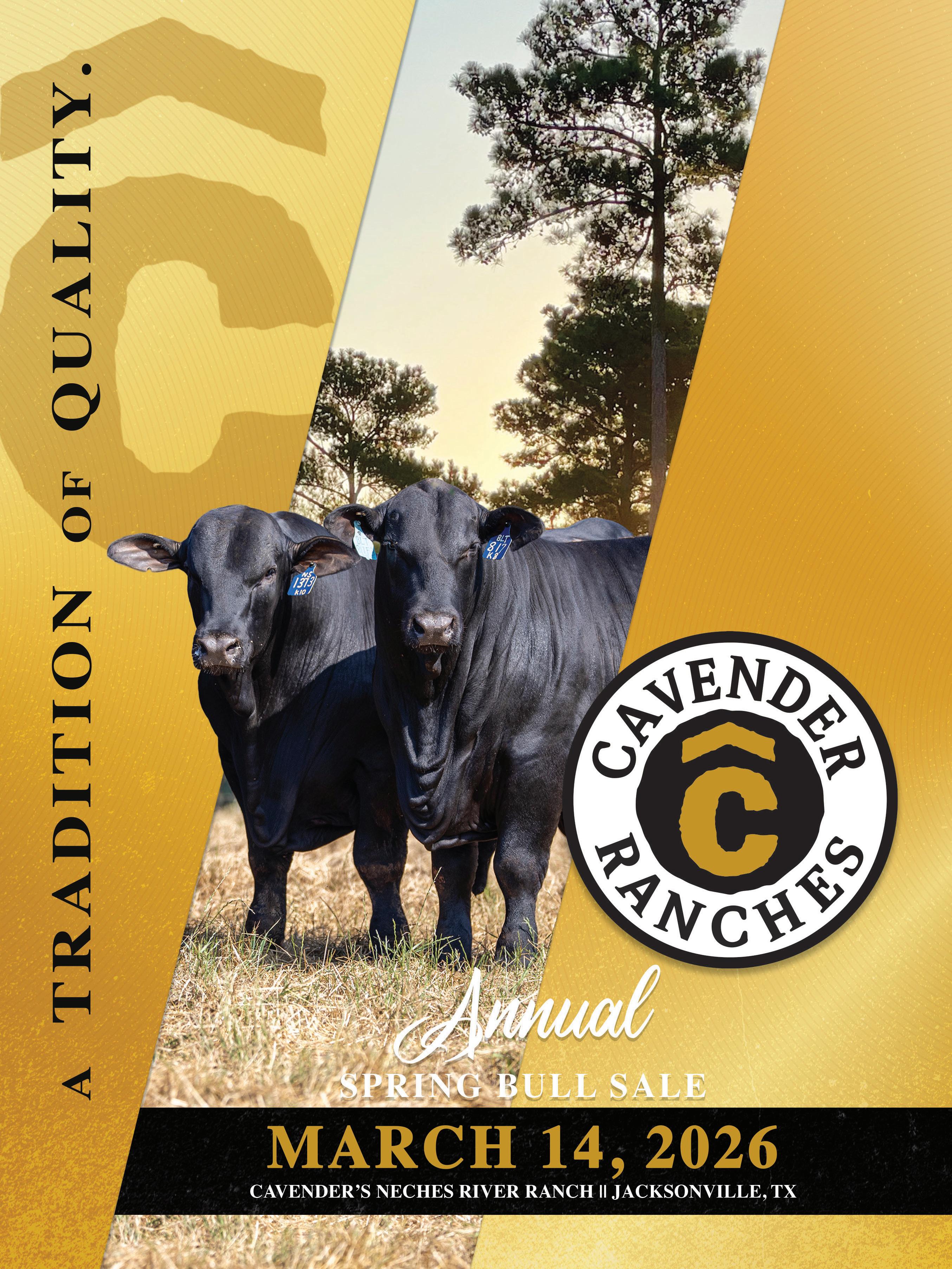 Welcome to Cavender Ranches for our annual Spring Bull Sale. THANK YOU to all of our customers and friends for your support in a historic 2025. Your confidence in our program and where we are going was gratifying! We are pushing the performance envelope while raising practical, realworld cattle to fit your needs and your program. Our goal remains to produce beef bulls in volume that bend the curve from birth to yearling, are capable of siring steers that excel in the feedlot and hang the kind of beef carcasses that enable the industry to compete for center of the plate demand from consumers. Our commercial herd and our commercial focus helps us to stay real.