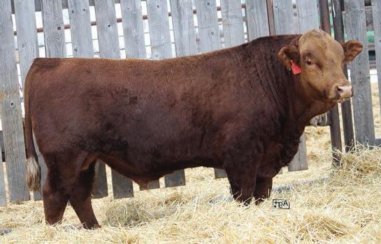 Typical RF Patent 283K son. Interesting genetic heritage including SVS Betts 808F, Wheatland Stout 930W, Harvie Red Summit 54B, TNT Gunsmoke U223, WFL Red Sage 506C, RF Certainly Flirtin 202Z. Adair Ranch 911G has produced a herd bull for Jeff Glasier.