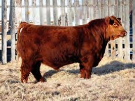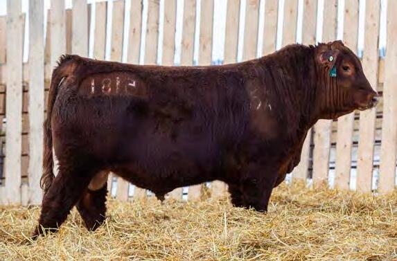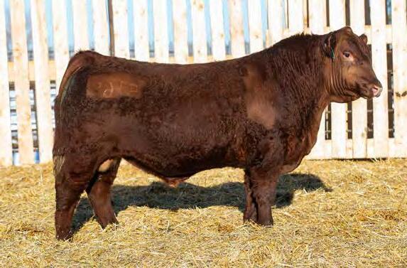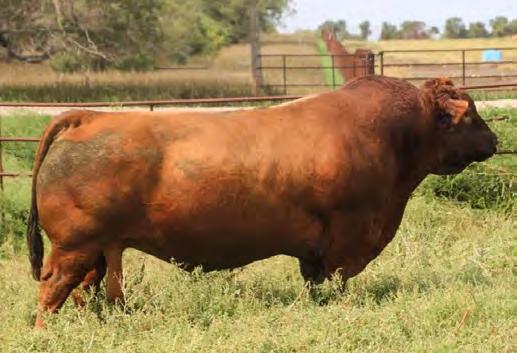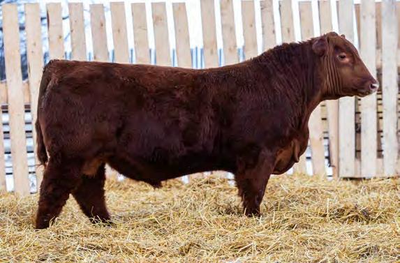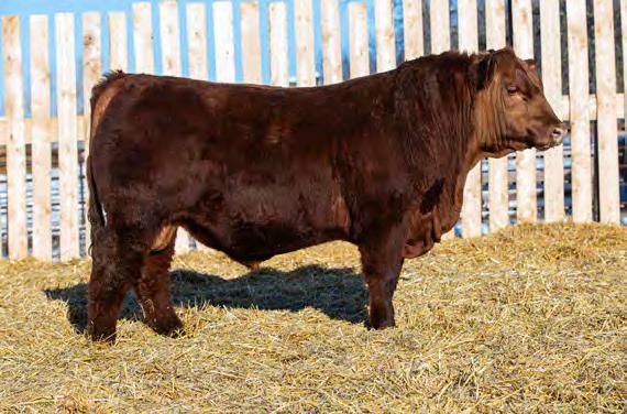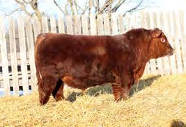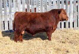 Our leadoff bull this year is a very unique and desirable individual. He combines calving ease, muscle definition, breed character and a very nice momma in a dark red package. When he walked in the picture pen Wes said” You better call some breeders on this rascal”. He was the 4th heaviest weaned bull calf in his group with a WW ratio of 109. His dam was purchased from Camo Cattle Co at Red Round Up and has registered 5 progeny including bulls we sold to Clarion Colony and Garry Griffith.