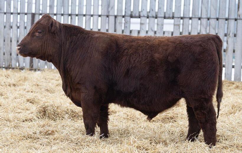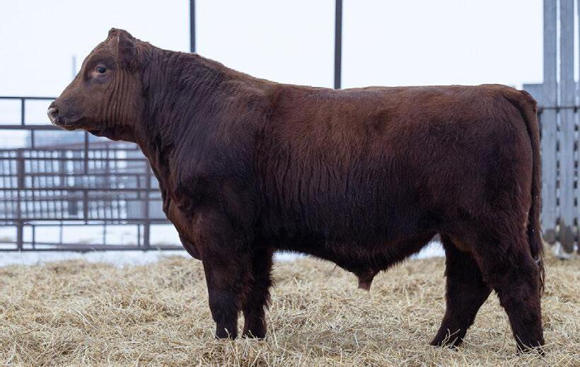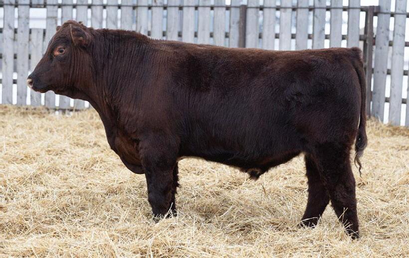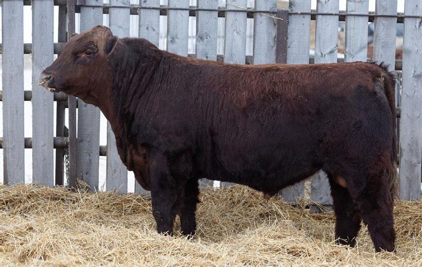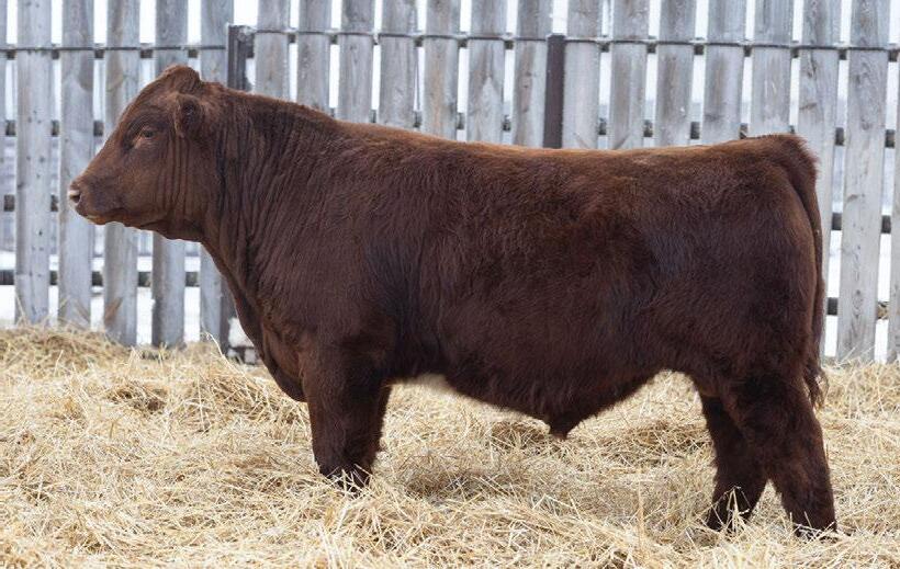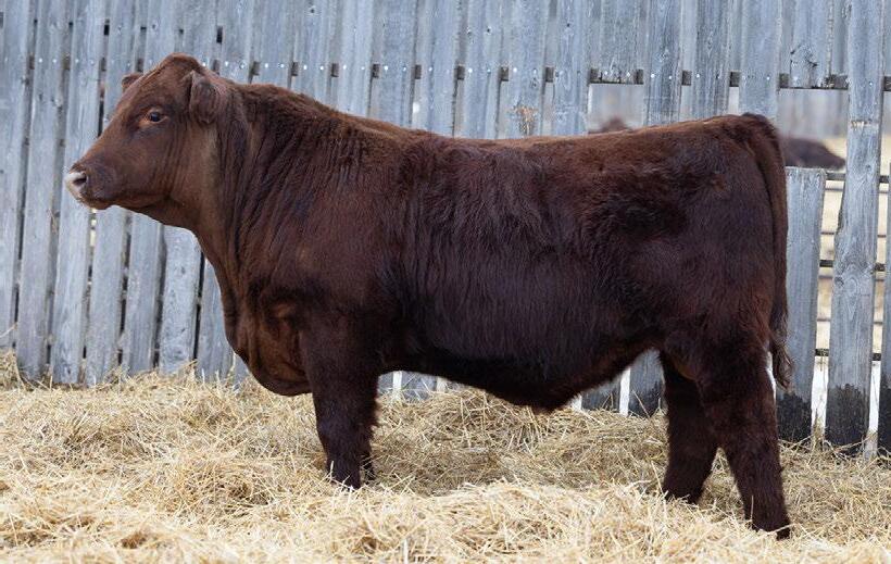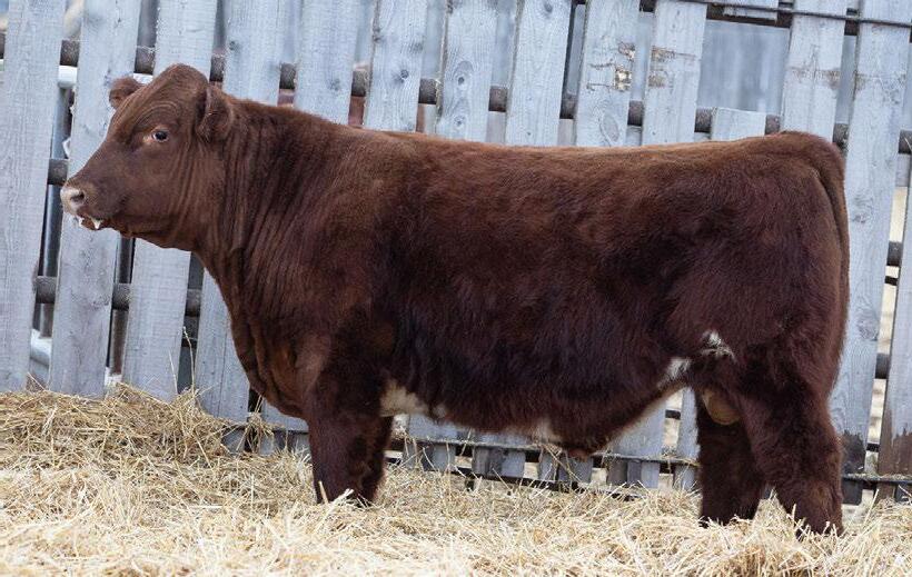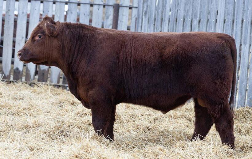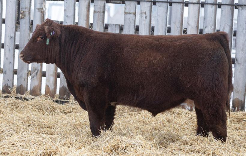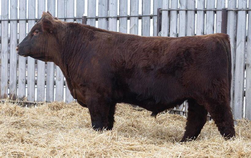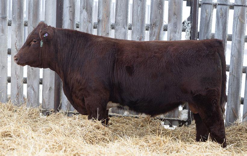A dark cherry red heifer bull that will still add some growth into his calf crop. 100% SHORTHORN