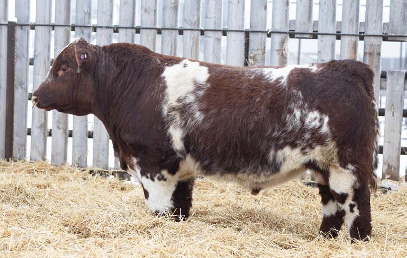 A well muscled, thick topped, good footed bull sired by Birdtail Frontier 51J. 100% SHORTHORN