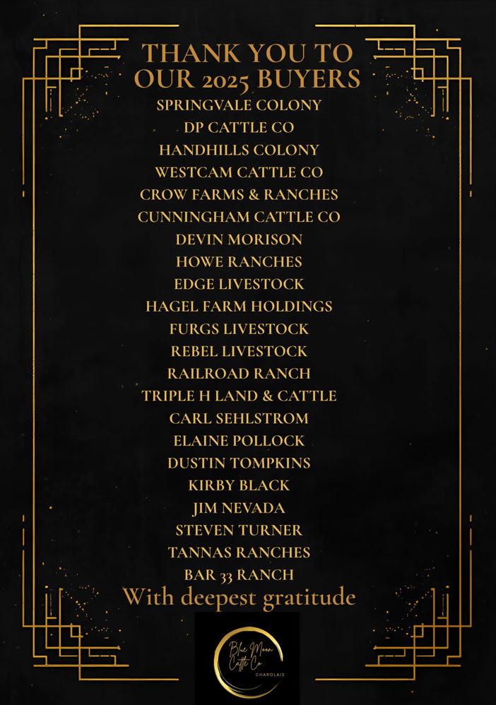 I want to extend a heartfelt thank you to my parents for the countless hours spent feeding, doing chores, and keeping things running at home while I am away at school — their support behind the scenes makes it possible for me to continue chasing this dream. I would also like to thank Blue Moon Cattle for inviting me to consign to their sale. A sincere thank you as well to Kailey Wirsta for her work on this catalogue, and to Robbie Chomik for capturing the cattle through his photography — your contributions help bring this program to life. And last but not least, I want to thank everyone who has mentored, supported and answered my questions over the years. Your kindness and generosity does not go unnoticed.