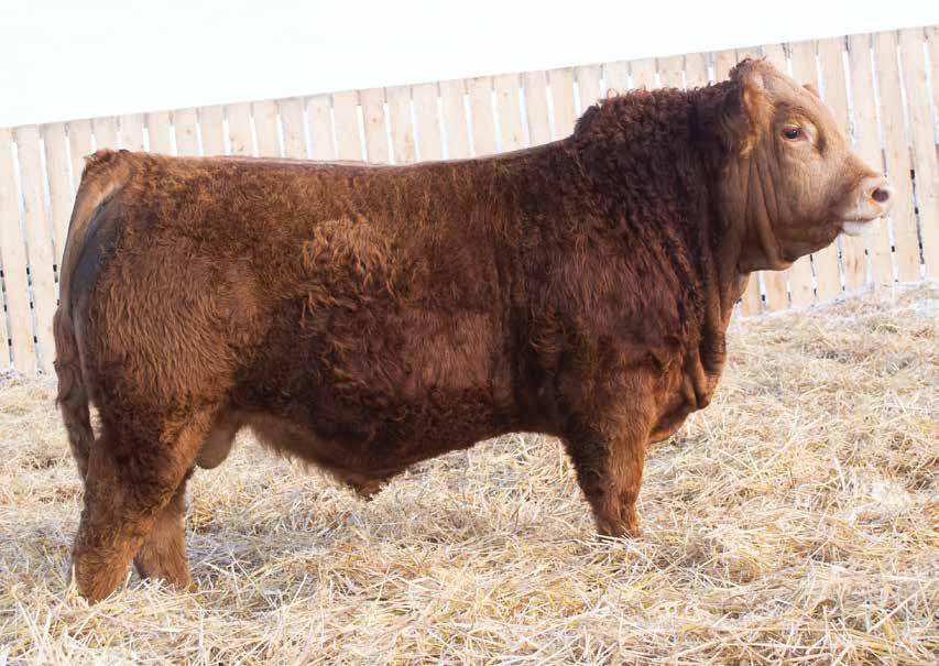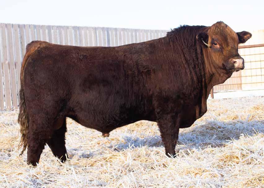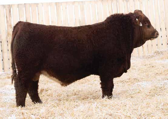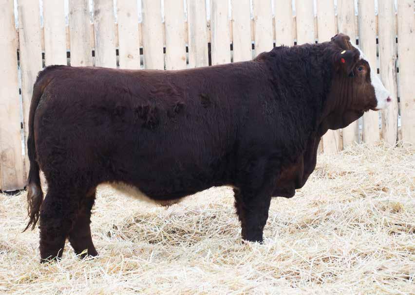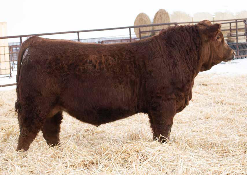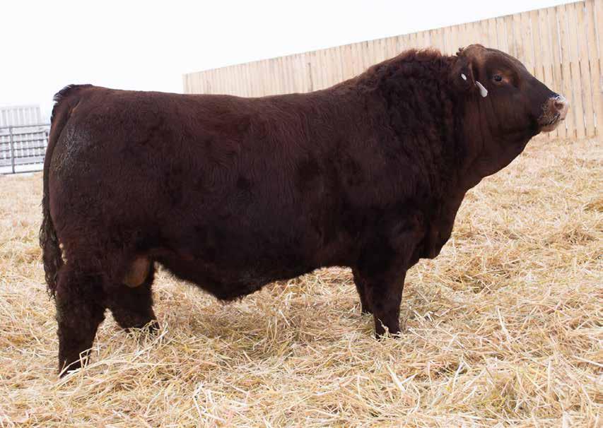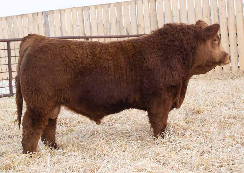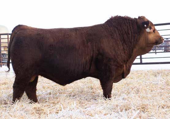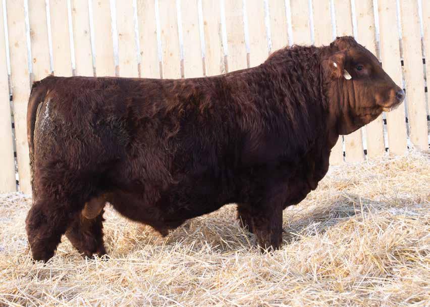 HOMO POLLED. PUREBRED. APPROVED FOR HEIFERS. This is another big haired, dark liver red calf off Top Tier that likely is my favourite. I enjoy breeding cattle that are coloured and built like this. His dam was purchased on the lead off pair at the Werstroh Dispersal where we bought 68L along with her dam 3H. Nice small birthweight of 83 lbs, another bull that will calve easy but be extremely growthy. Not too often can you see a first calf heifer wean off a calf at 925lbs! He is ranked high in the calving ease EPD and one that is going to really knock it out of the park. Come see his Dam in person, we feel she is the ideal type and kind of cow that we strive to build a cowherd around. You’ll know he’s the real deal once you get in the pen with him.