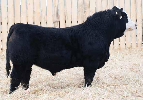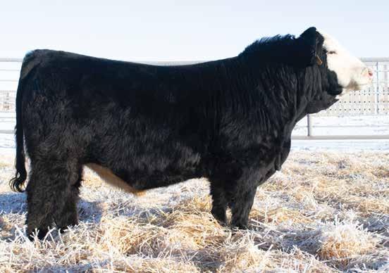 HOMO POLLED. HETERO BLACK. 3/4 BLOOD SIMMENTAL. APPROVED FOR HEIFERS. Another chance to acquire a black Top Tier calving ease bull. This one came super small with a big shot of vigour! 85 lb birthweight and off a RF Jaguar female. Jaguar was used successfully for many years in our heifer pen. Last year Jaguar raised the high selling bull in our sale! The 14L dam is a black baldie female who is very feminine and has a great amount of mothering ability. 67N has a great hoof under him and is extremely smooth and attractive in his throat and neck structure. Nice small head and clean shoulders. Calving ease bull that will make growthy calves!