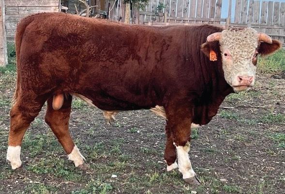Lester won grand champion bull calf at the Hardisty Field Day last year. His quiet demeanor has made him quite easy to handle. Lester is a long-ribbed bull with lots of thickness. He will fit in anyone’s herd quite easily and produce easy calving calves that will have high growth.