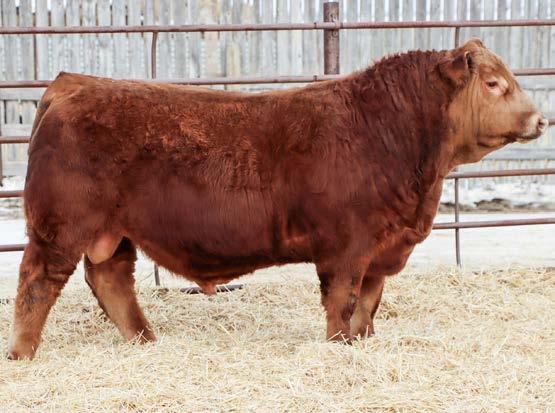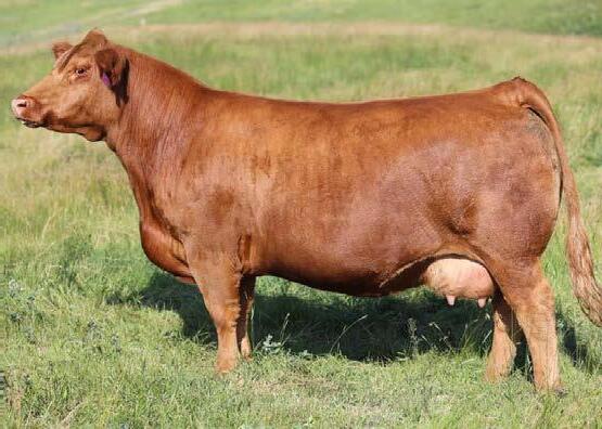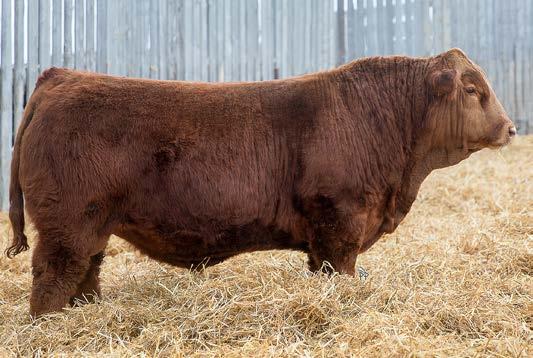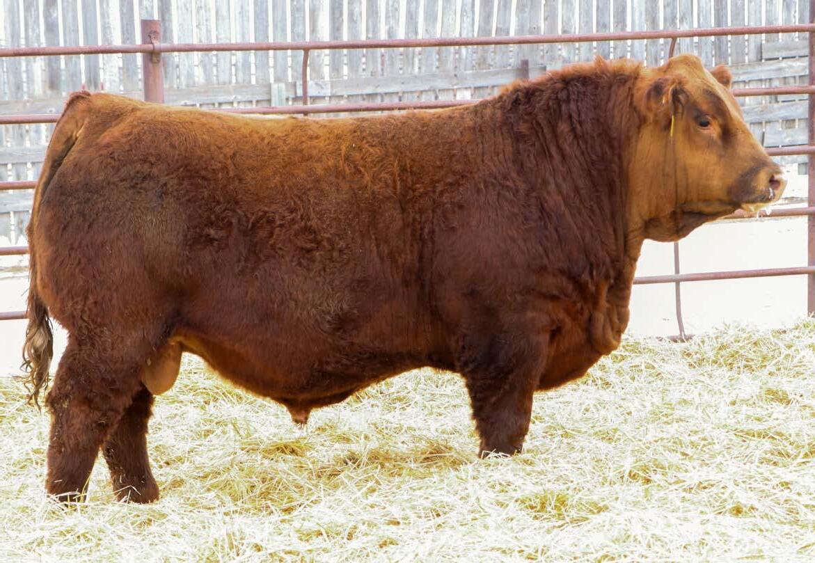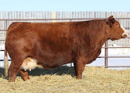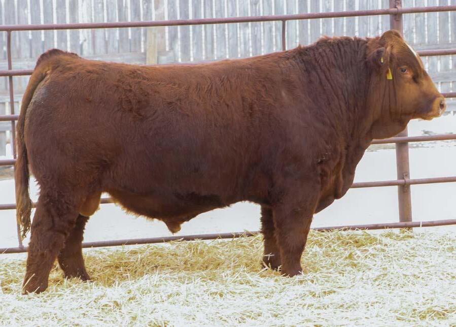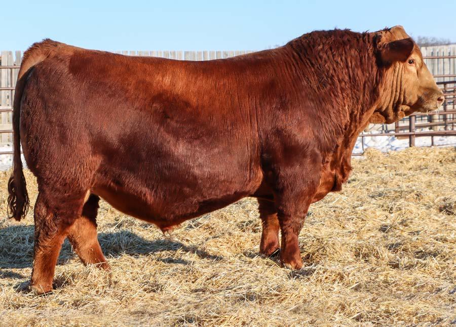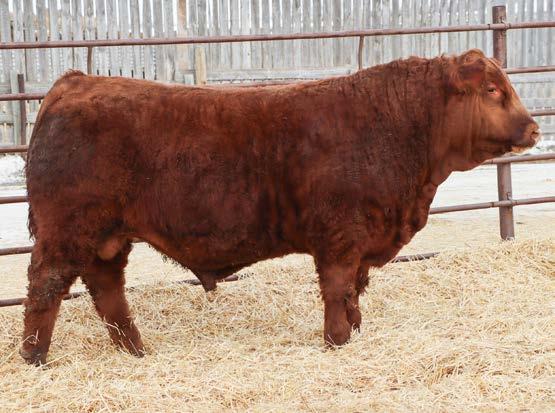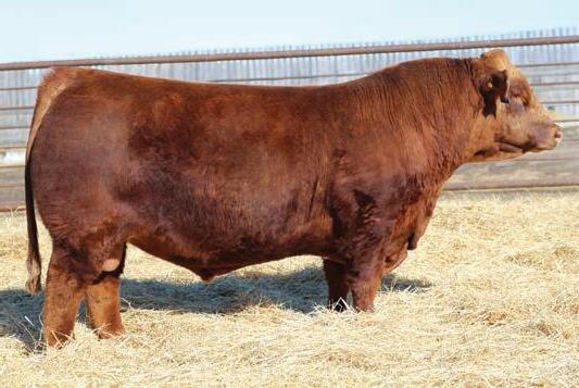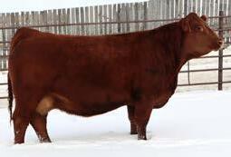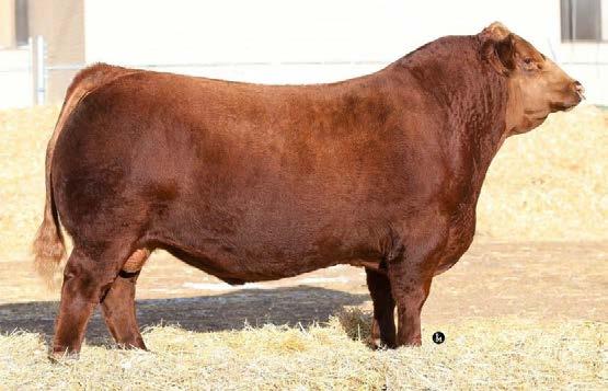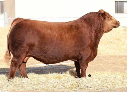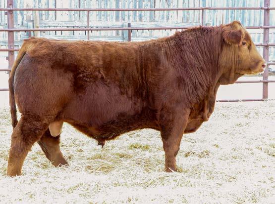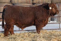 Dark red and long bodied to sire those big steers to really pound down the scales. Dam is an excellent uddered Thunder daughter going back to Anchor D Allison cow.