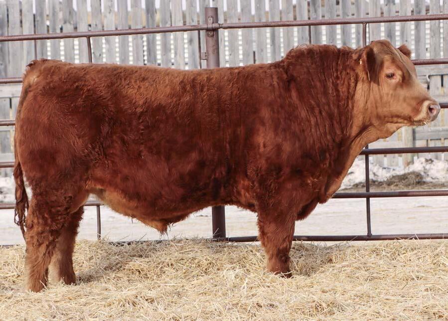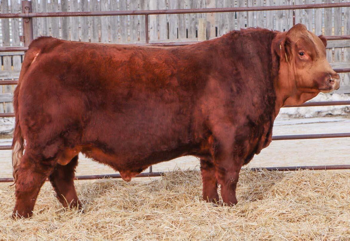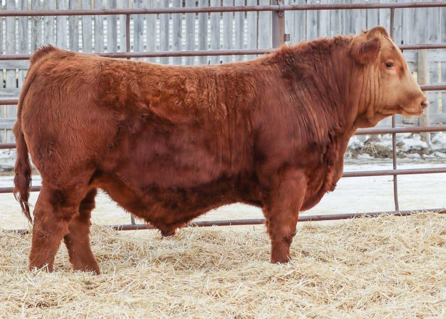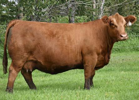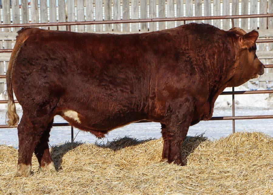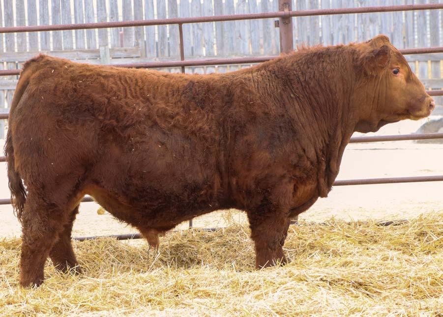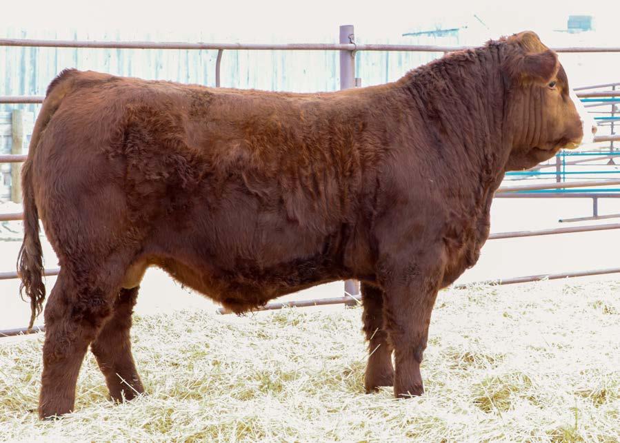 Dark red and long bodied to sire those big steers to really pound down the scales. Dam is an excellent uddered Thunder daughter going back to Anchor D Allison cow.