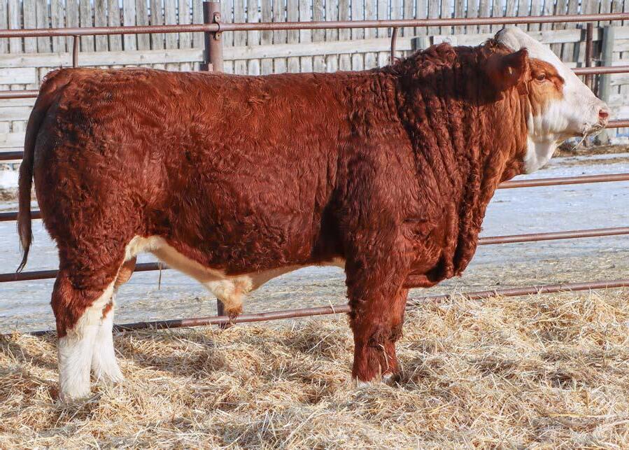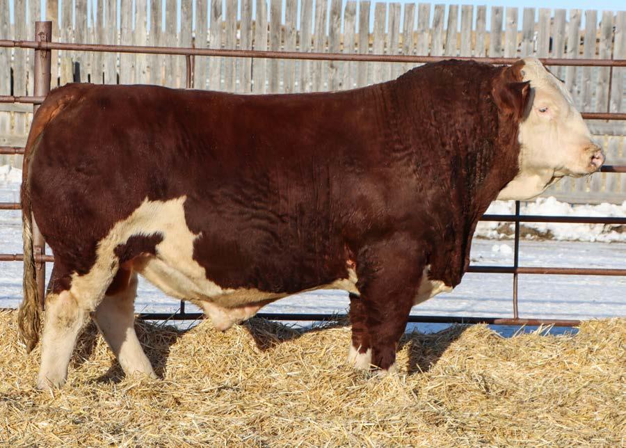 Solid built baldy bull. Length of spine and dam is as sound as they come.