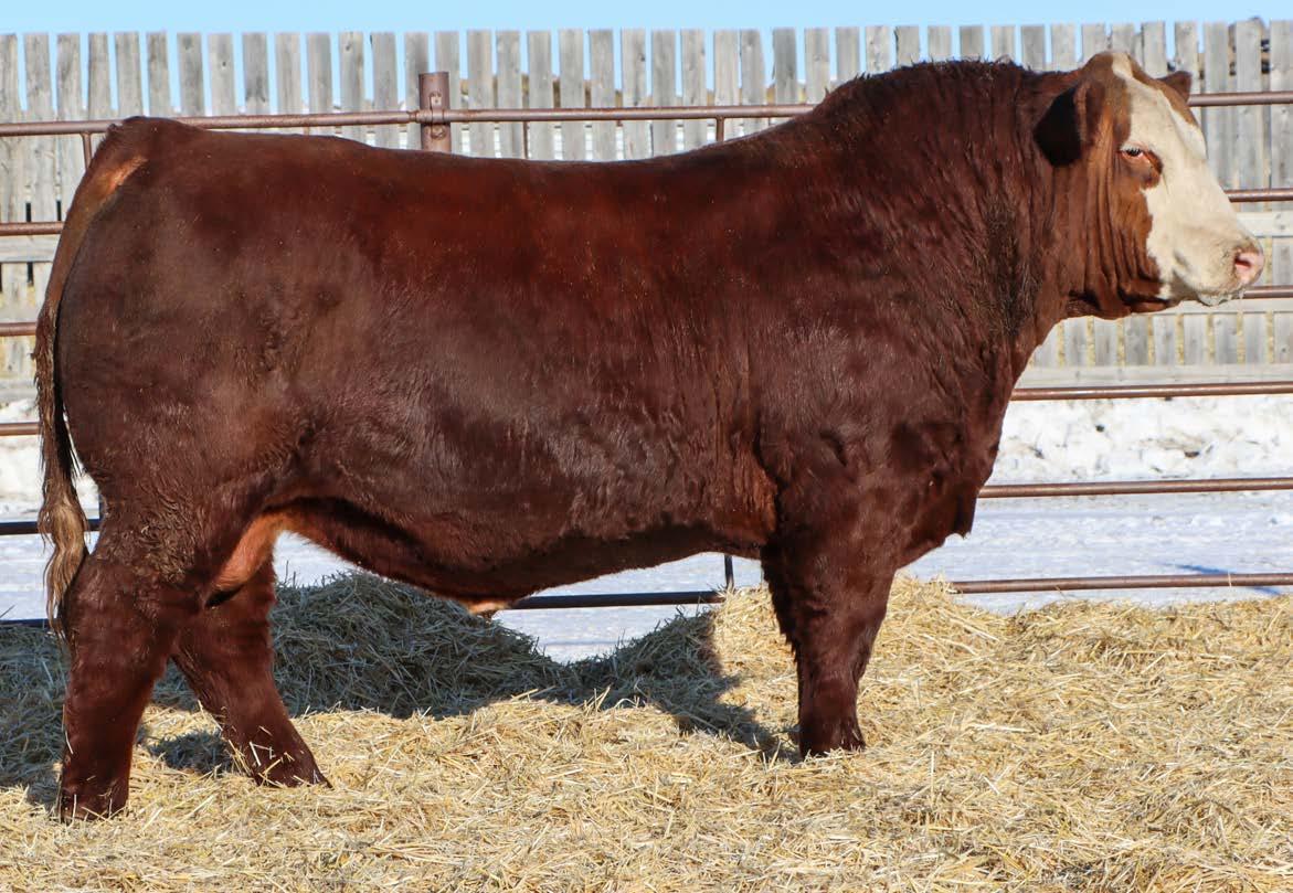 One of the youngest bulls in the sale. Attractive dark red blaze out of a Soda Pop cow from Black Gold