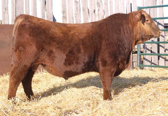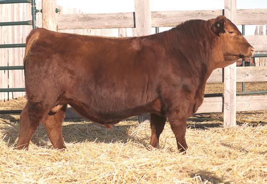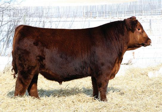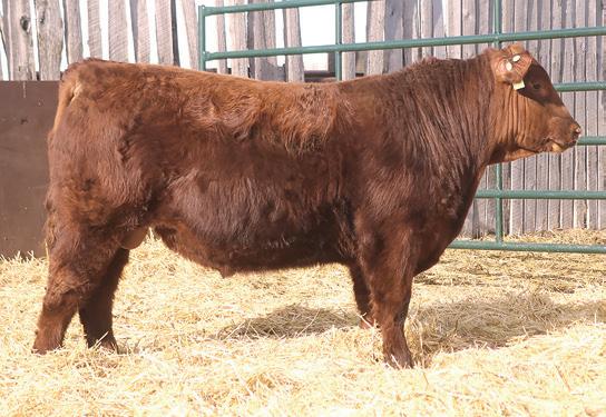 A bull that has nice body shape and a nice look to him li his sire. Mom is a deep middled, easy fleshing, dar r red cow.