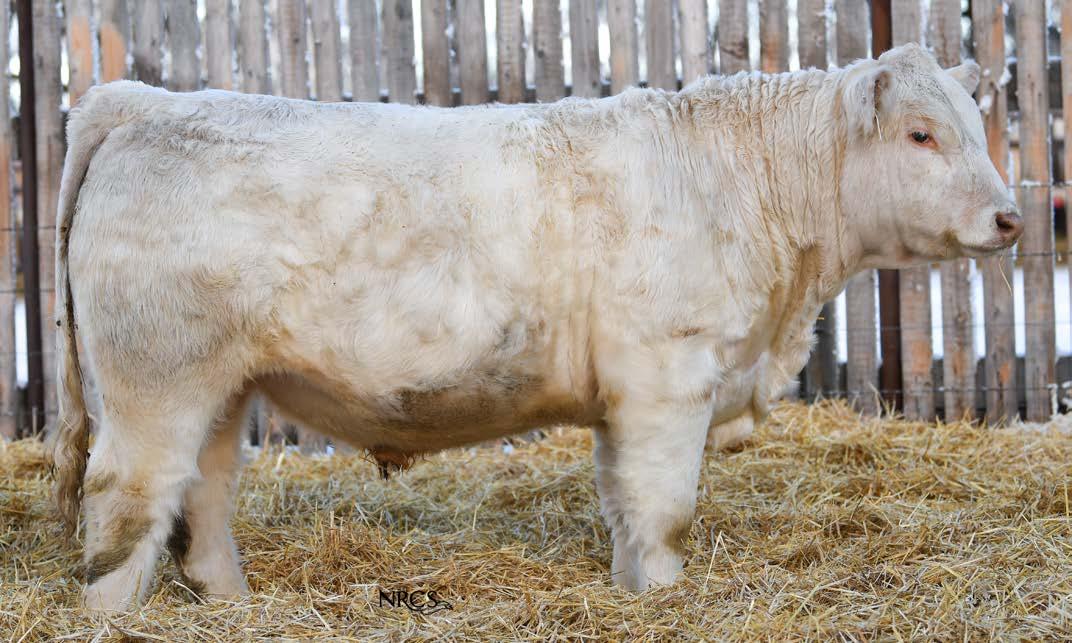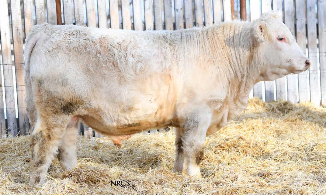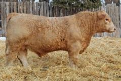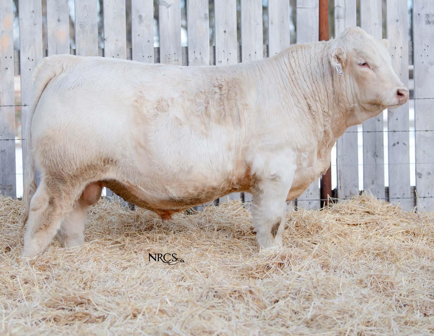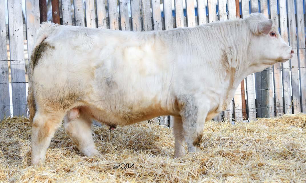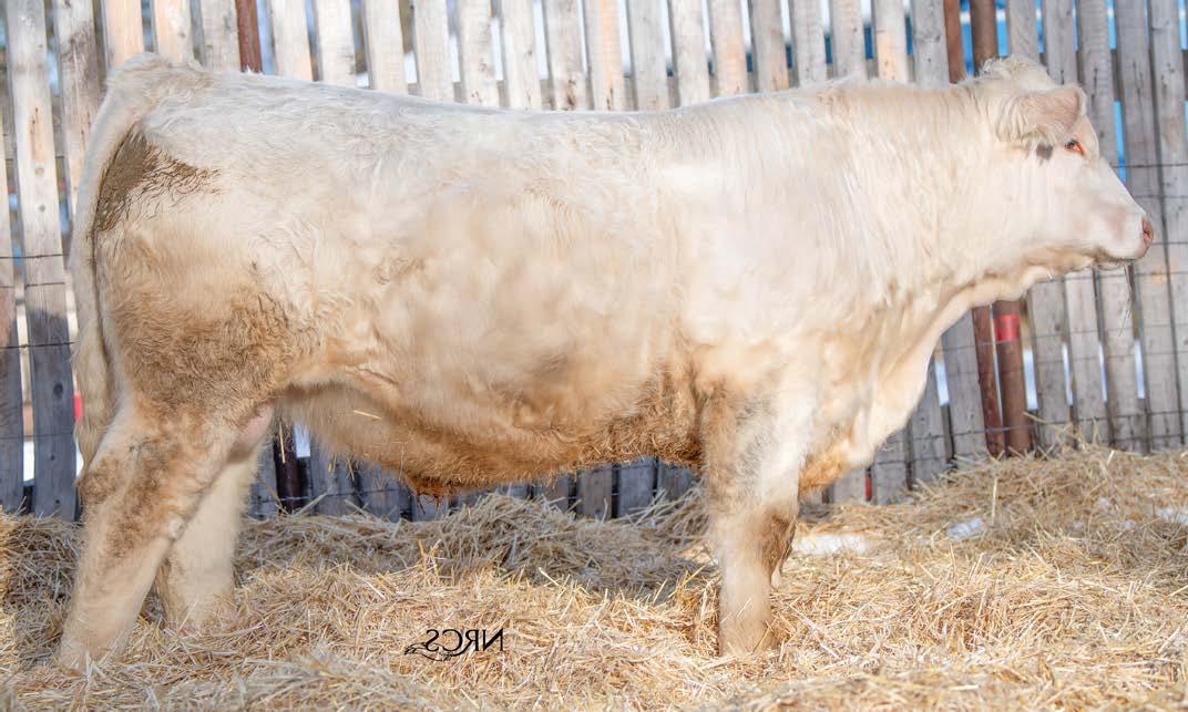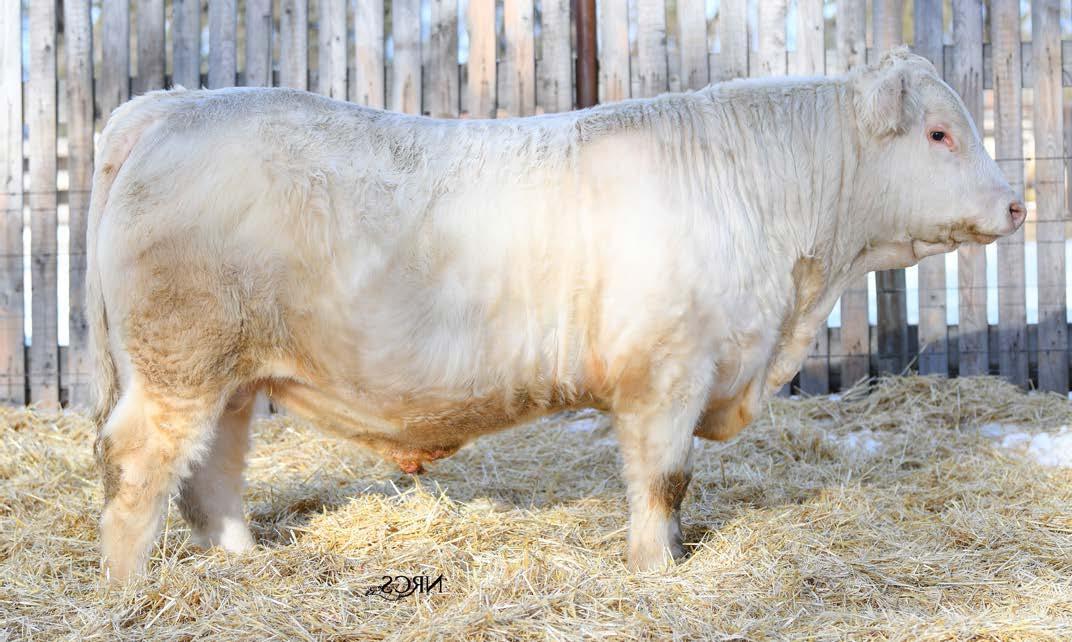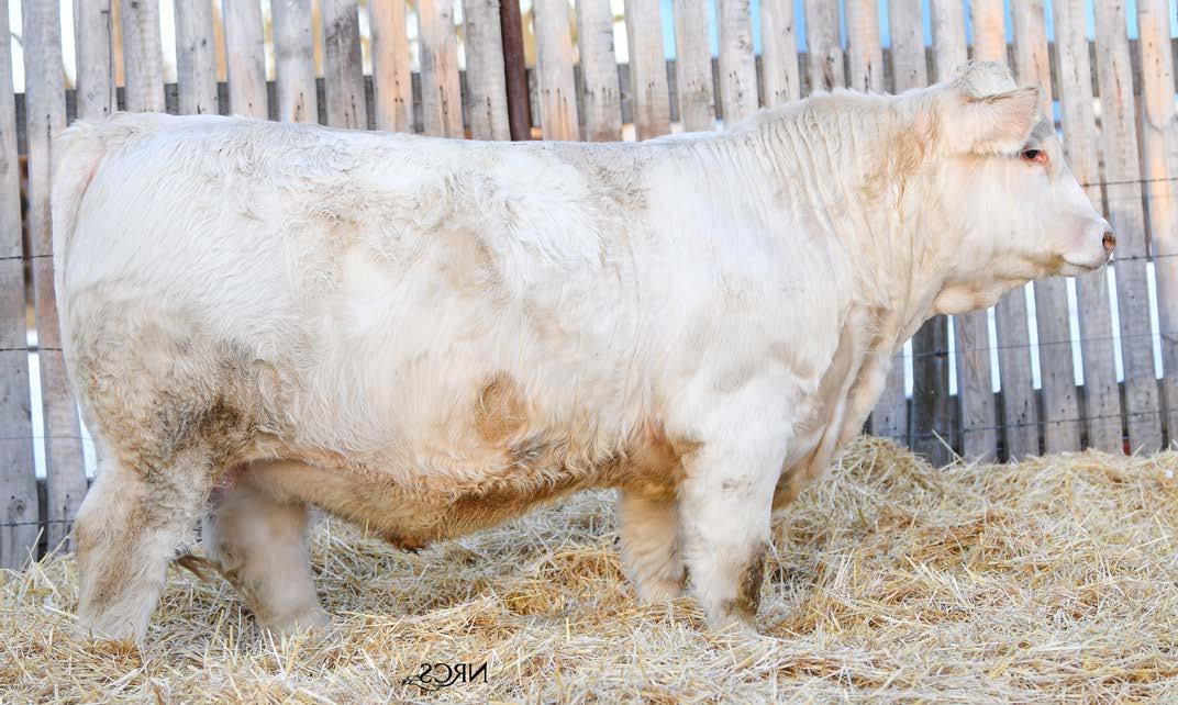 Purchased from Palmer Charolais as a cow bull. Used as a cleanup bull on late calvers for this crop of calves. He was a working machine; his cows were in the main calving pack the next year. His pen of bulls are generally larger framed and coloured. PROGENY