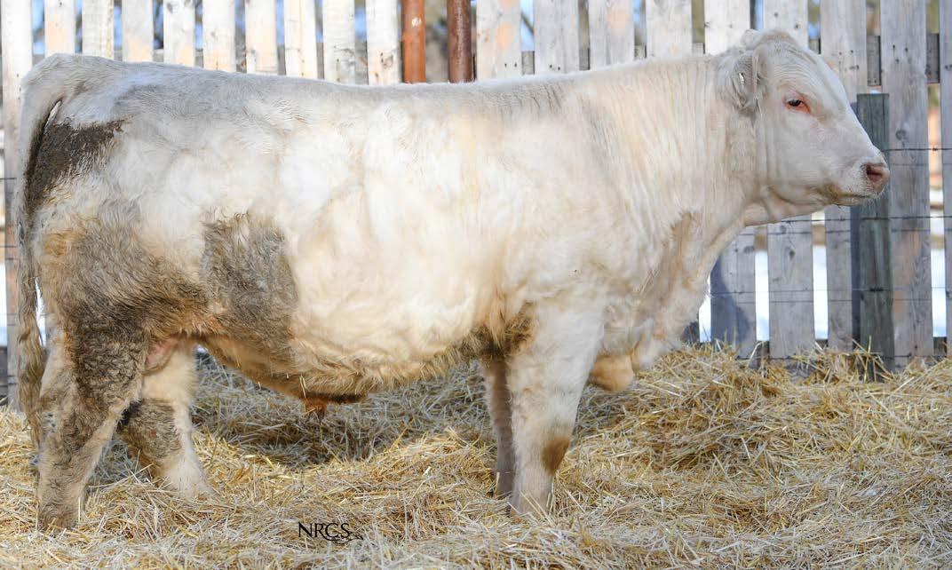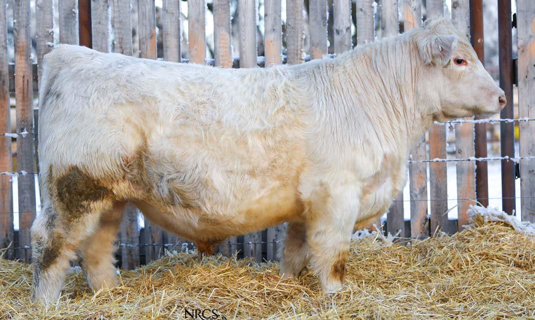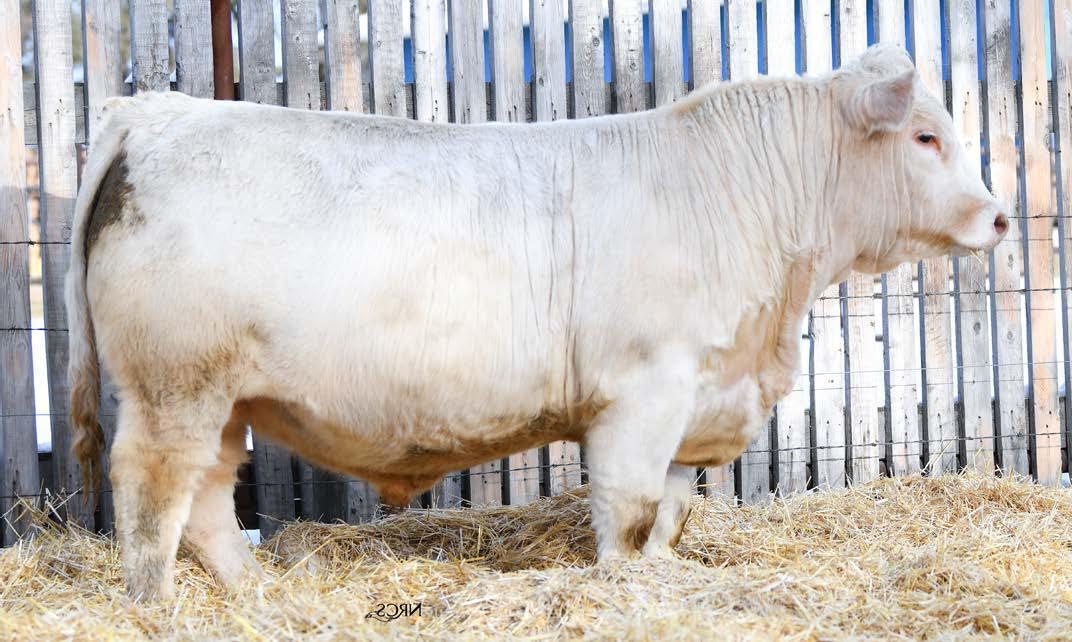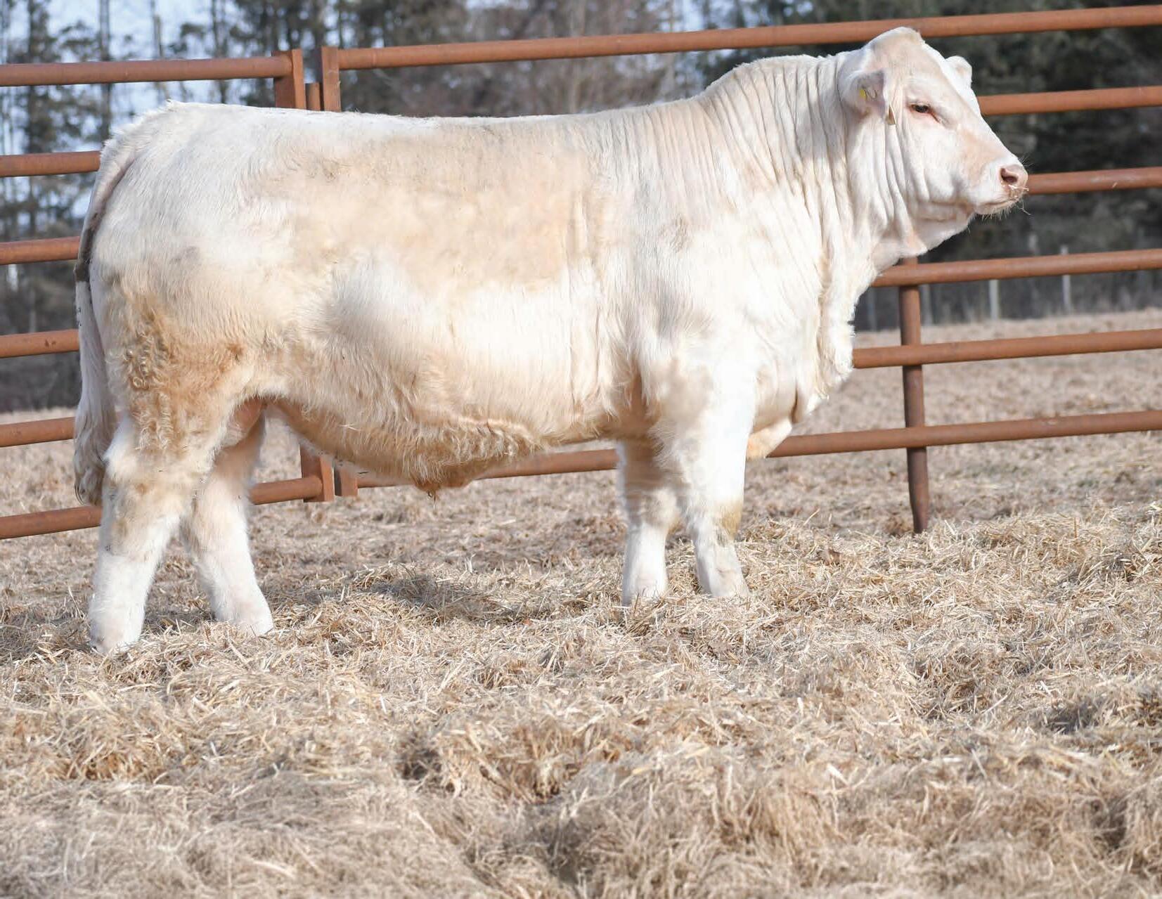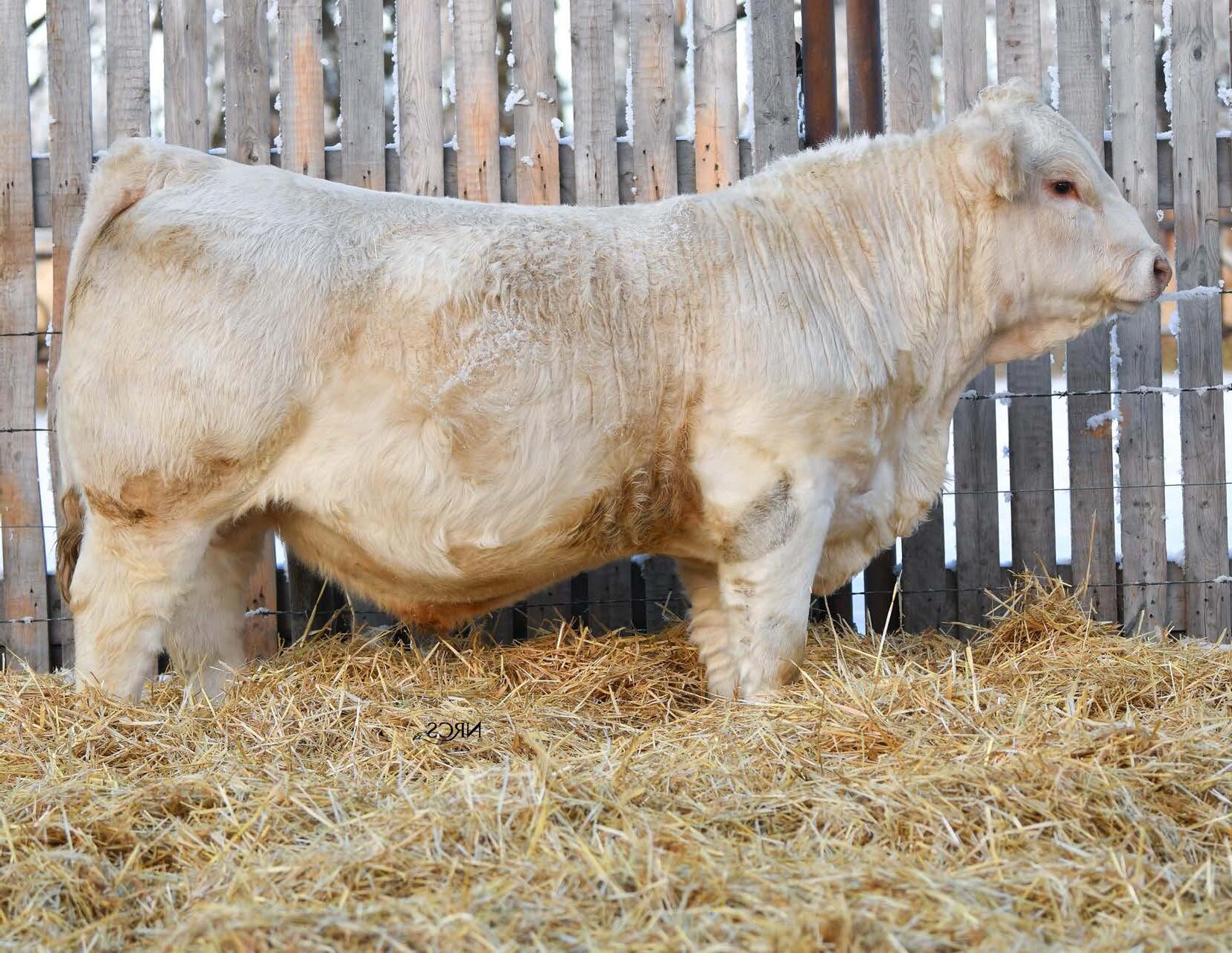 Purchased from Palmer Charolais as a cow bull. Used as a cleanup bull on late calvers for this crop of calves. He was a working machine; his cows were in the main calving pack the next year. His pen of bulls are generally larger framed and coloured. PROGENY