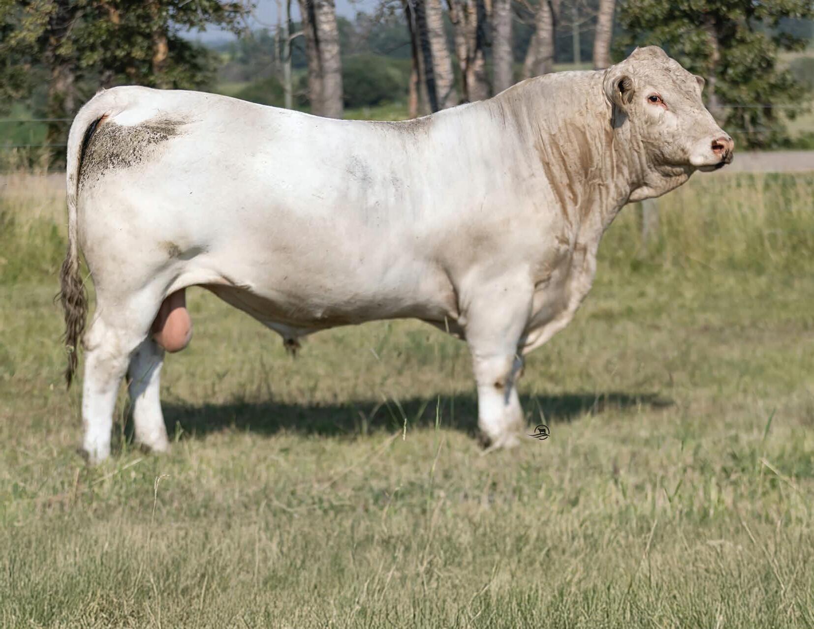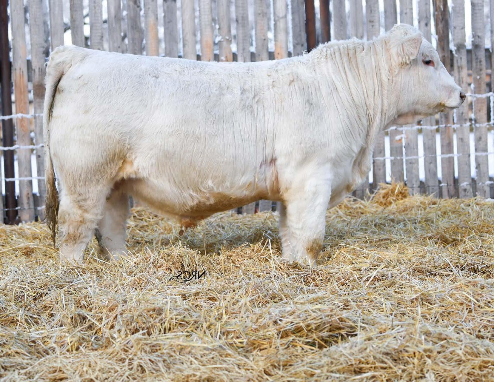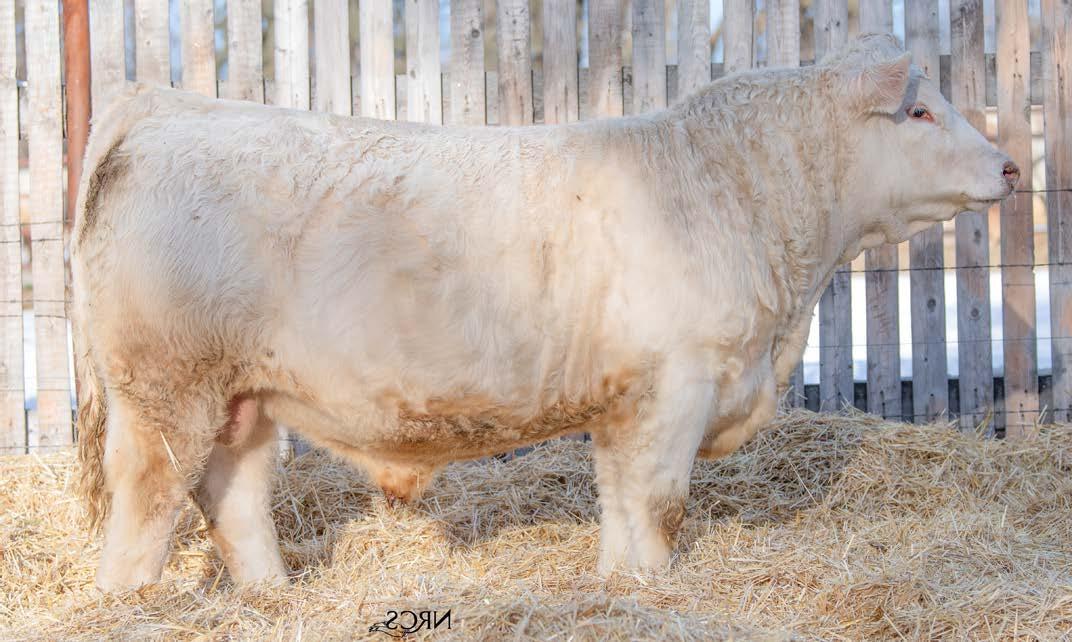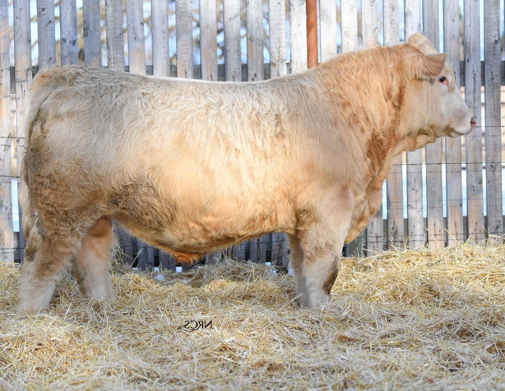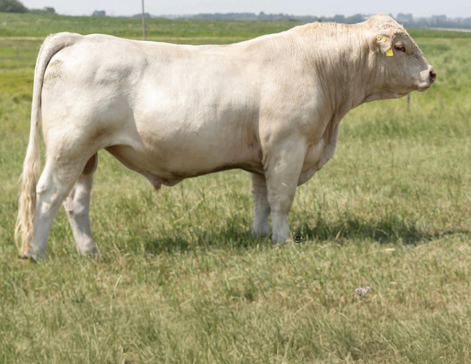 Purchased from Palmer Charolais as a cow bull. Used as a cleanup bull on late calvers for this crop of calves. He was a working machine; his cows were in the main calving pack the next year. His pen of bulls are generally larger framed and coloured. PROGENY