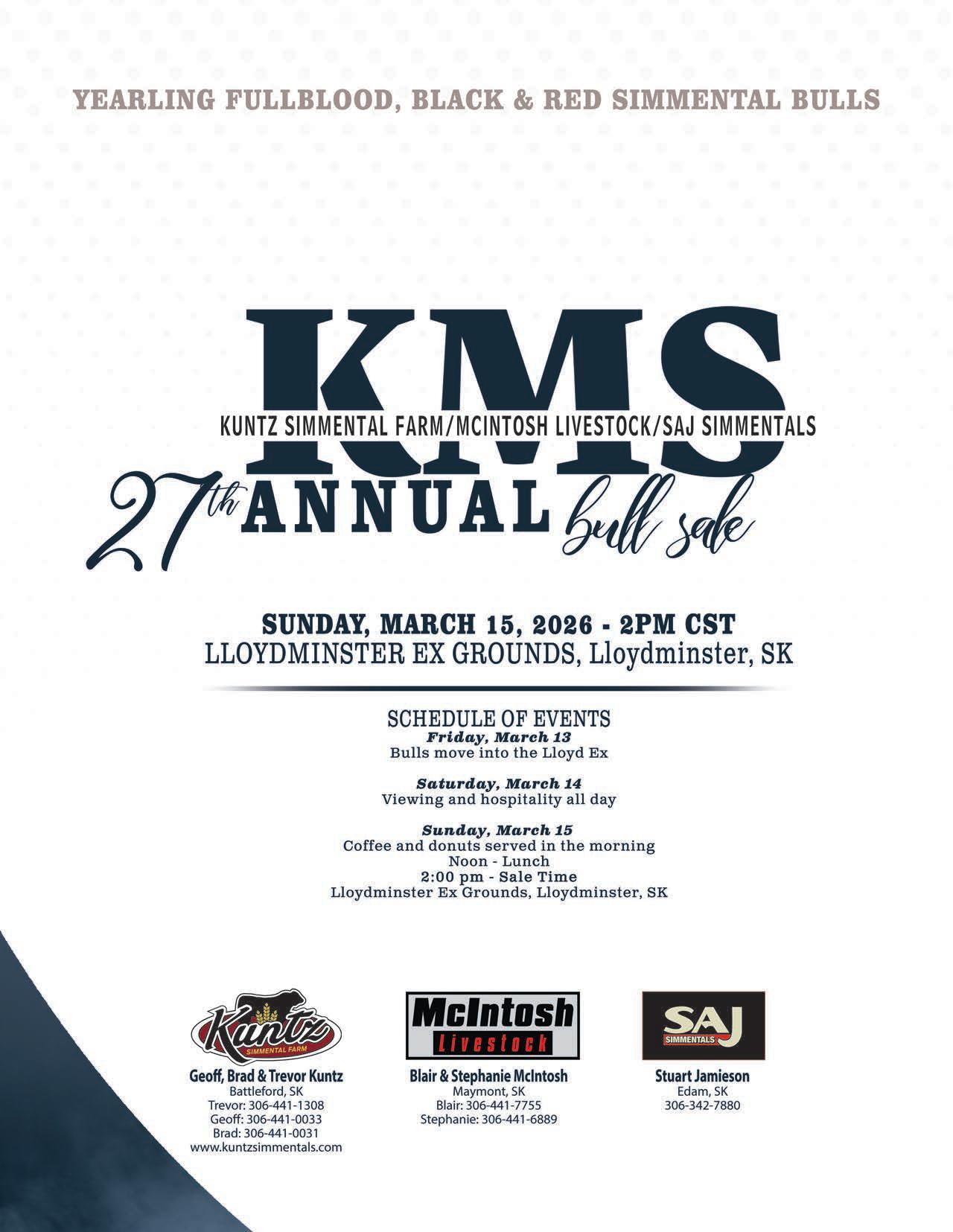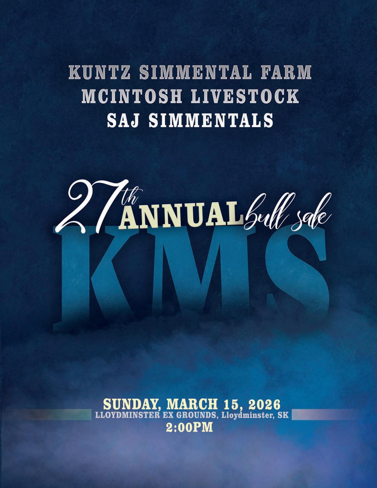 Welcome to the 27th annual, Kuntz McIntosh SAJ Simmental Bull Sale. What an incredible time to be a livestock producer. The cow/calf operator’s are finally seeing a premium for their hard work and dedication to an industry they love and it is truly rewarding to see and I do know we can speak for these 3 great operations when we say that seeing your success is their own personal greatest success. We are proud to stand beside these long standing breeding establishments in the promotion of their 2026 sale bulls, we think you will find it is a very uniform and diverse set and offers something for everyone, no matter what their needs are. We hope you take this as your personal invite to join us in the beautiful Lloydminster Exh Sales pavilion on Sunday, March 15th at 2pm.